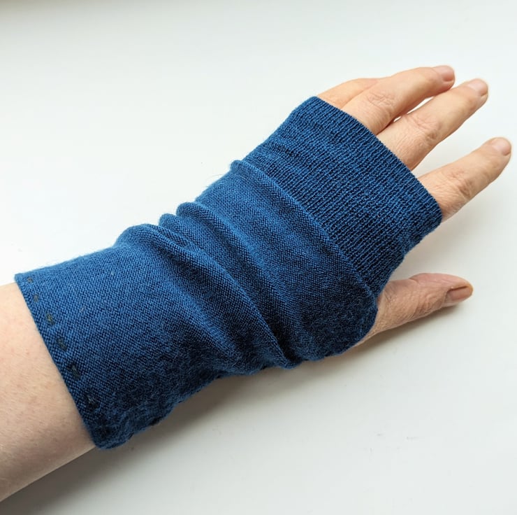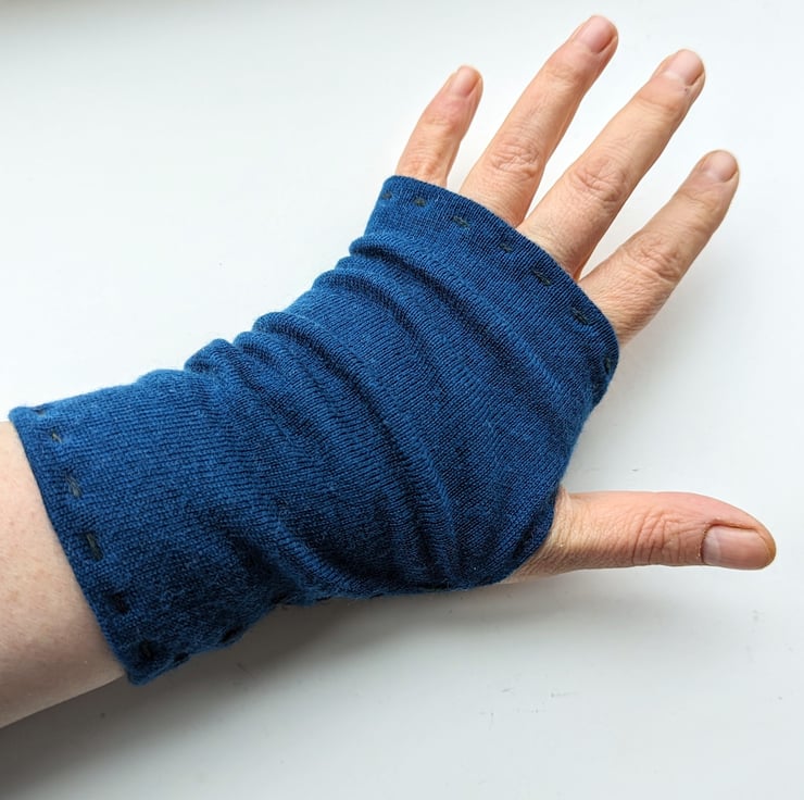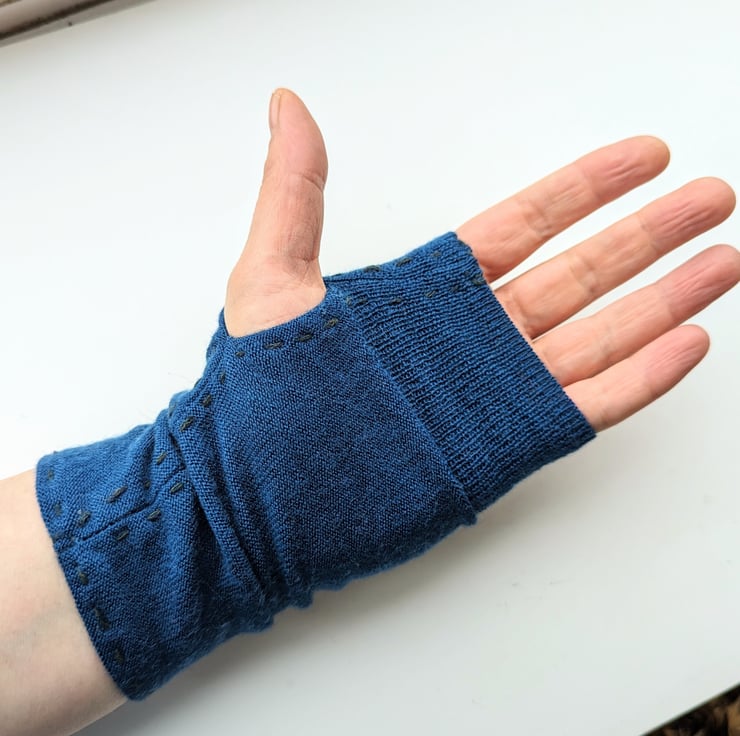 Wrist warmers are great both indoors and out; keeping warm while working from home but still able to type/write/sew or out shopping but no need to remove to keep removing. Finished with hand stitch detail.