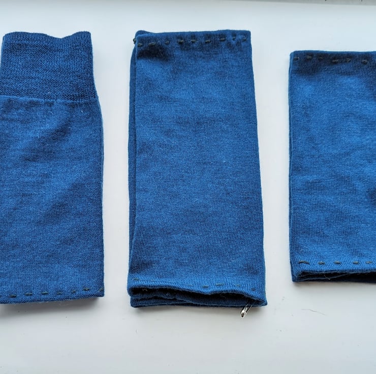 I use old clothes as the main materials for my textile art which I usually buy from the sale rails or discount bins in charity shops. I often saw sad old jumpers; bit bobbly, needing darned or misshapen but perfect to chop up and make with. My daughter was sad that she had grown out of a festive jumper (bought in a charity shop) and so I turned it into wrist warmers for her and thought these would be particularly great gifts this year as people are trying to save mover on heating.