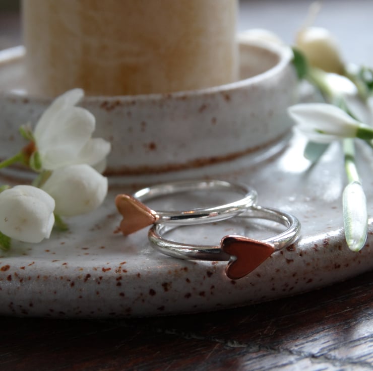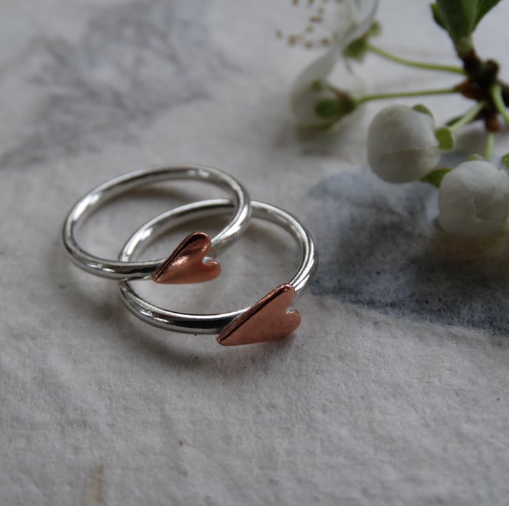 This dainty little ring has been formed by hand from recycled sterling silver wire and copper sheet using traditional silversmithing techniques. It features a little copper heart which is inspired by the scarlet tiger moths that visit our garden every midsummer - the orange markings on their outer wings make a little heart shape.