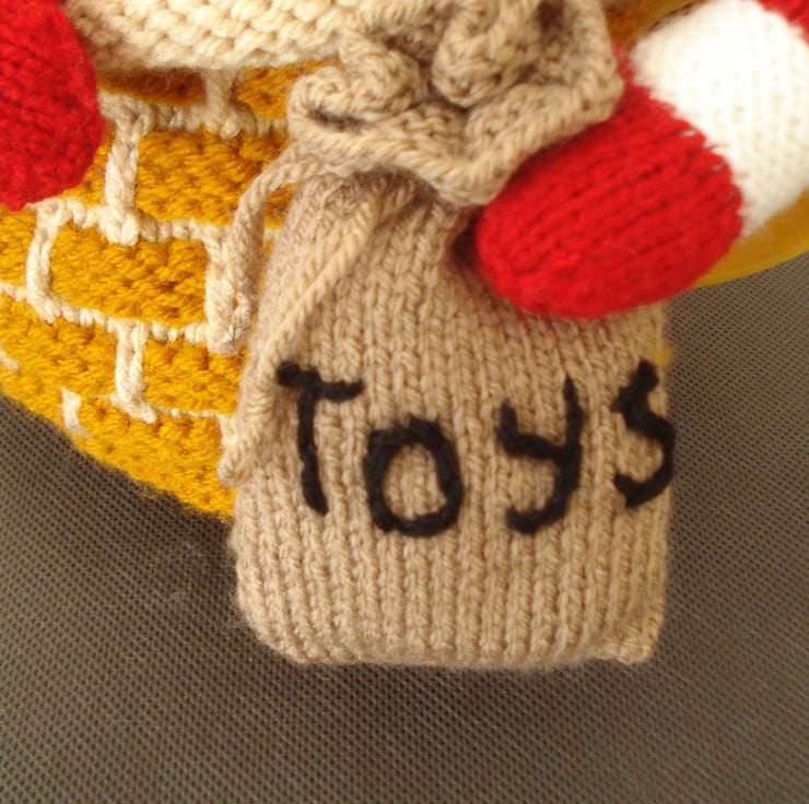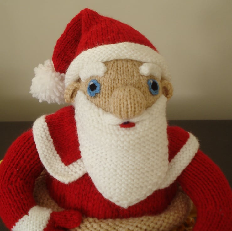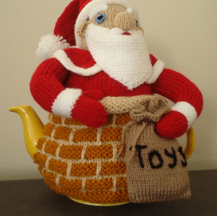 This is a four to six cup tea cosy in the shape of Santa with a sack of goodies stuck down the chimney. Santa has a white beard and a red bobble hat, the chimney is knitted in dark orange bricks. he has a padded sack with toys written on it. Would make a lovely Xmas present.