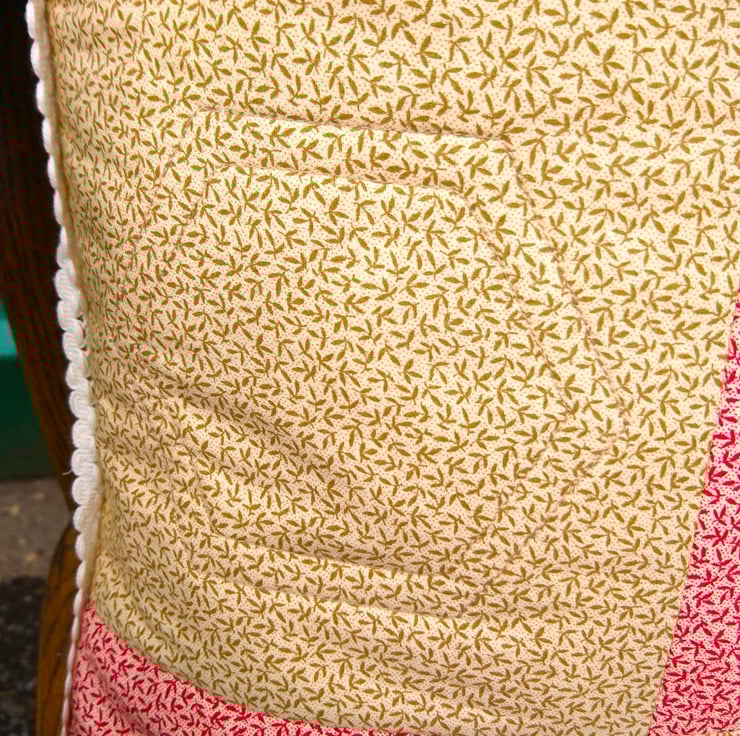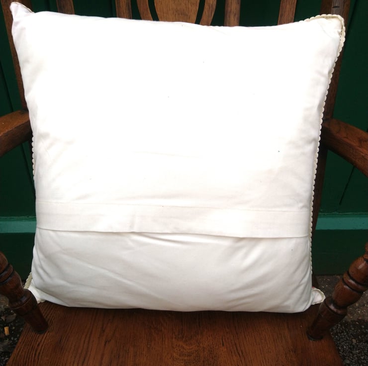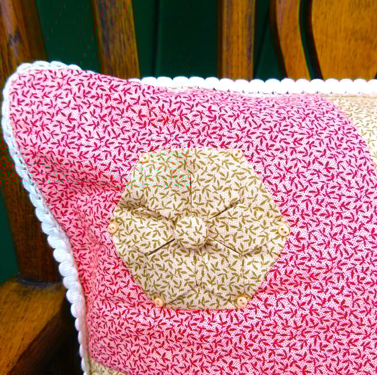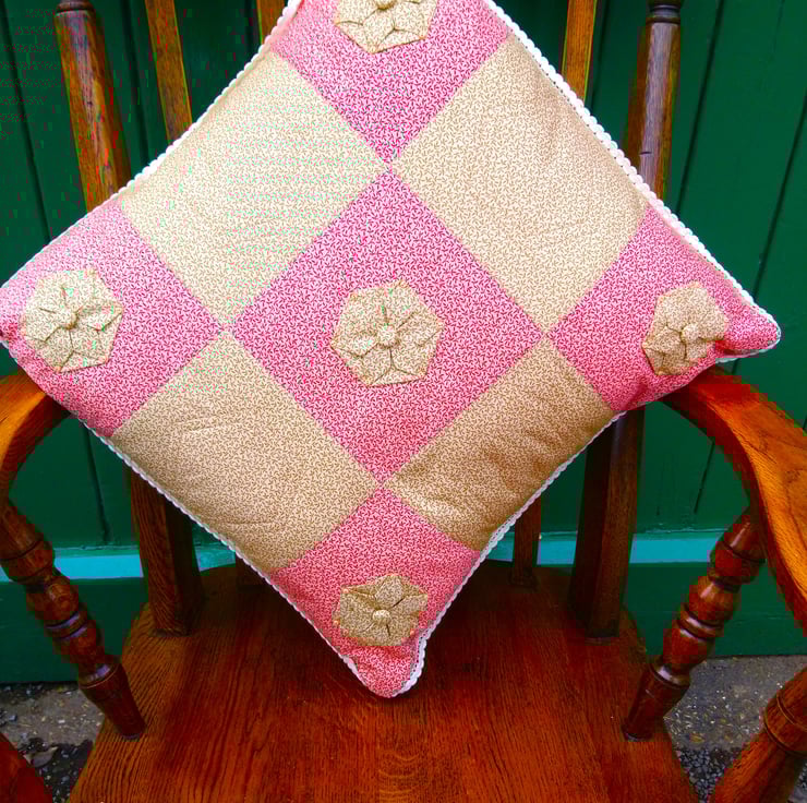 This Cushion Cover is made up of 9 x 16.5cm squares in red and Beige100% cotton fabric. Squares are embellished with a self fabric flower. The flowers are embellished with micro buttons on the edges and a self covered button in the centre. The other squares are top stitched in a hexagon design to compliment the flower squares. The whole cushion is edged in cotton lace. The back is plain cream fabric with an envelope opening.