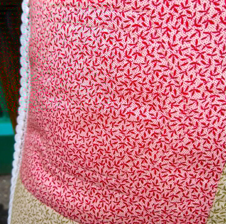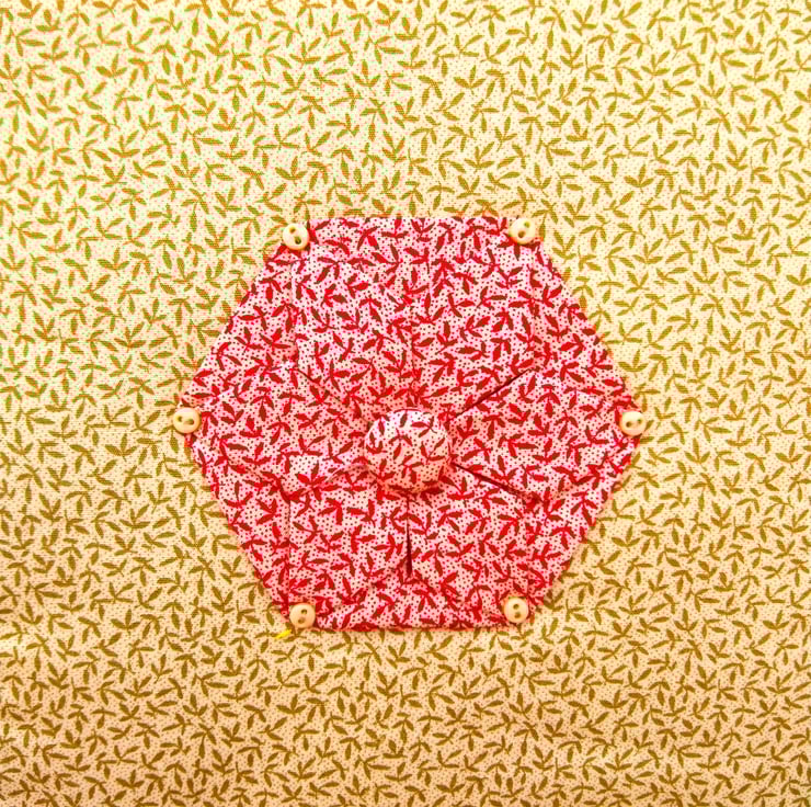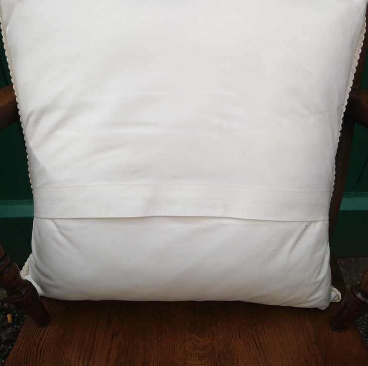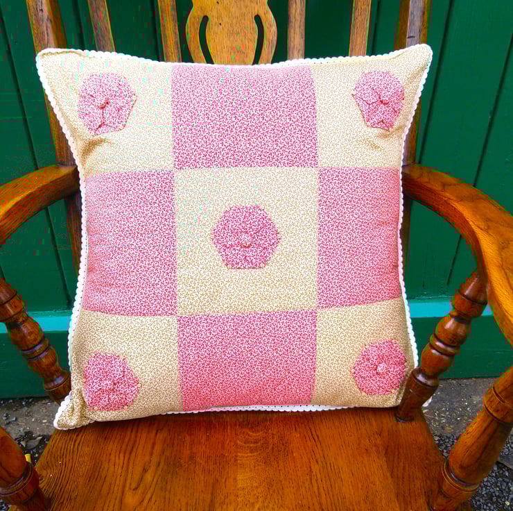 Cushion Cover is made up of 9 x 16.5cm squares in red and Beige100% cotton fabric. Squares are embellished with a self fabric flower. The flowers are embellished with micro buttons on the edges and a self covered button in the centre. The other squares are top stitched in a hexagon design to compliment the flower squares. The whole cushion is edged in cotton lace. The back is plain cream fabric with an envelope opening.