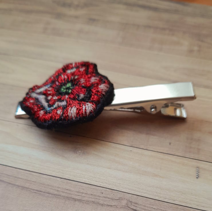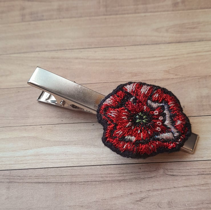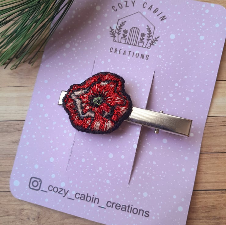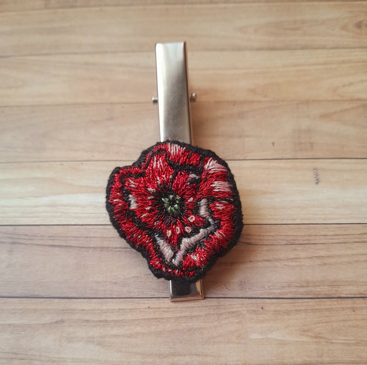 Hand embroidered with DMC light effects and tightly secured onto a stainless aligator slide.