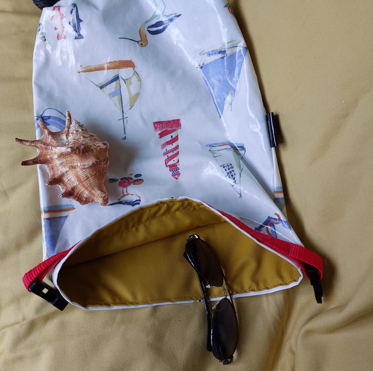 Pack away all your wet gear after swimming or the gym. Handmade using an oilcloth fabric outer with a nautical design. Item is lined with a mustard rubberised waterproof fabric including a handle inside to assist hanging out to dry after use. Drybag measures 38cm in length and is 31cm wide, depth of boxed corners are 10cm. item has a rolltop using webbing and is secured using the attached clip. This item is waterproof and has a wipe clean outer.