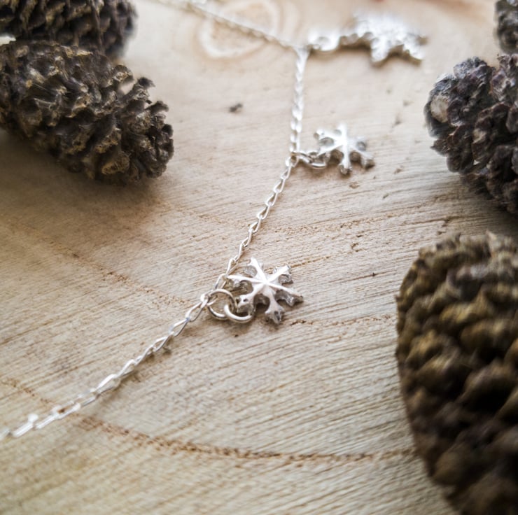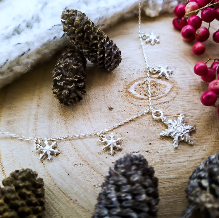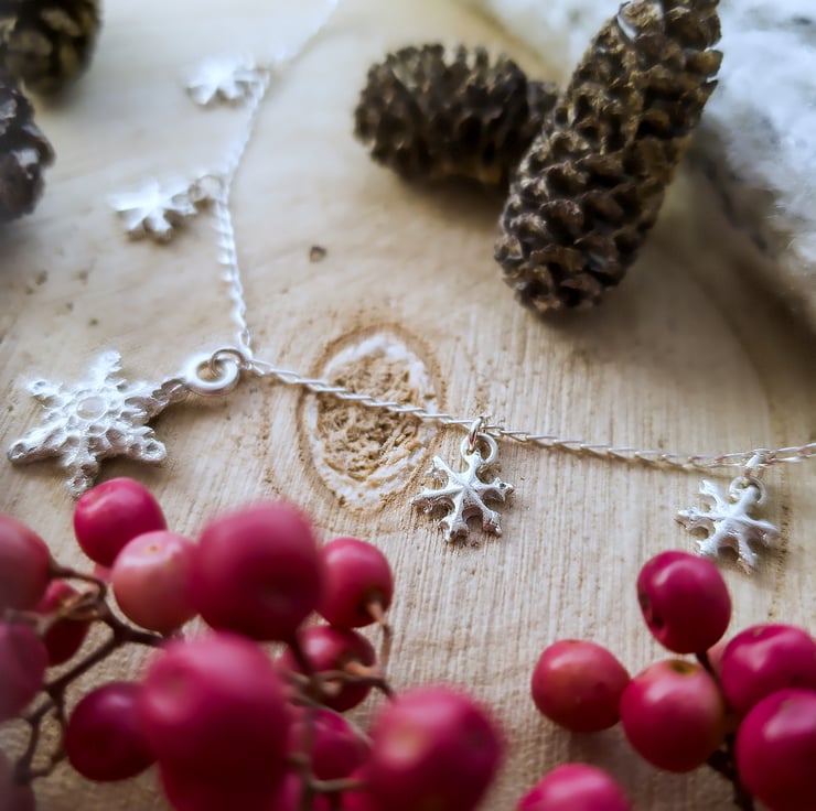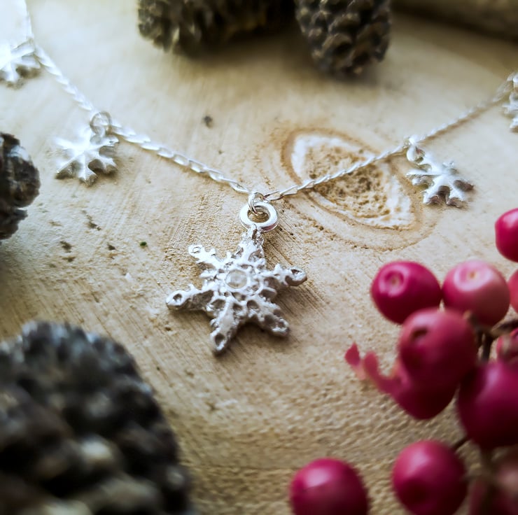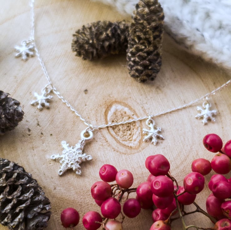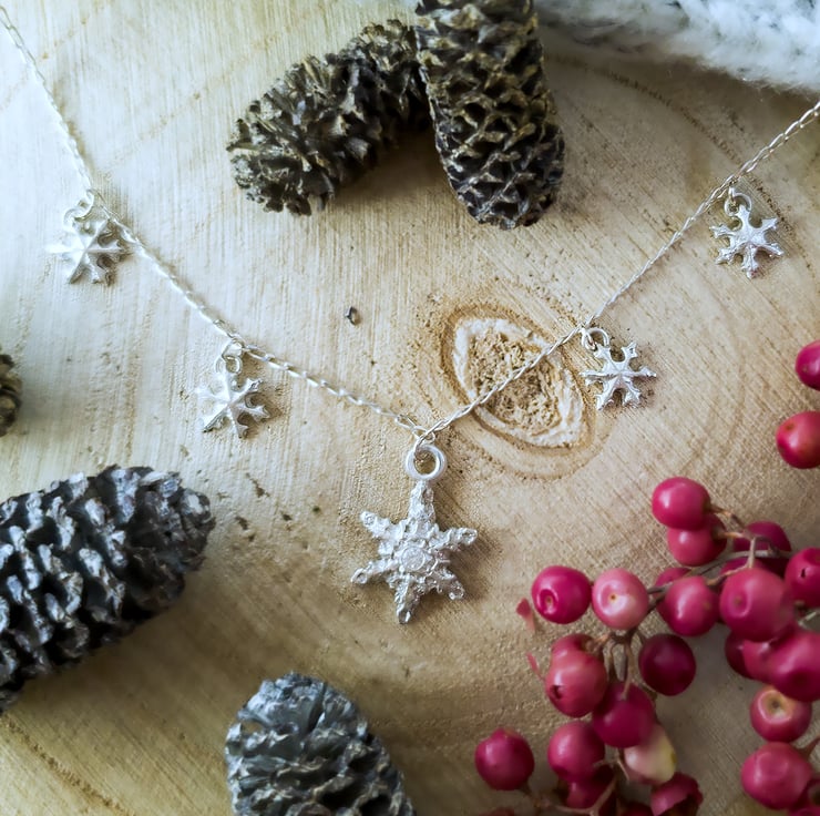 This gorgeous sparkling snowflake necklace is the perfect Christmas gift that can be worn all year round. Each of the snowflakes has been lovingly handcrafted in recycled fine (99.99%) silver using silver clay, and the largest snowflake is set with a cubic zirconia gemstone in the centre for that extra touch of sparkle.