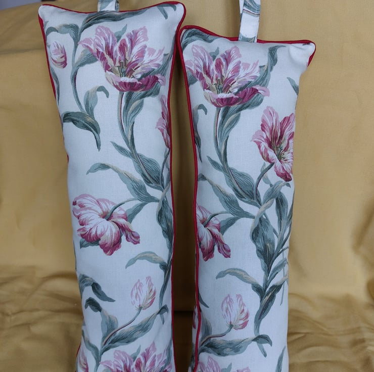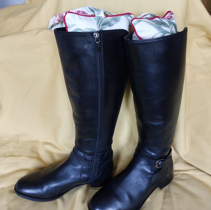 Handmade boot stuffer made with a linen vintage floral pattern furnishing fabric in pinks and cream with a red piping, filled with a polyester toy stuffing. Item measures 18inches long and is 12inches in circumference. Made to keep your boots upright when not in use saving the shape at the ankles.