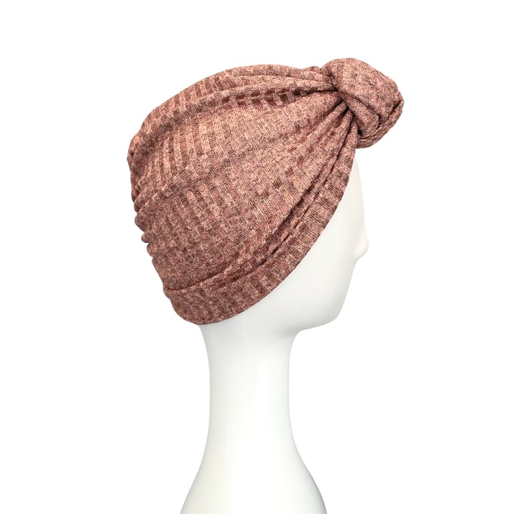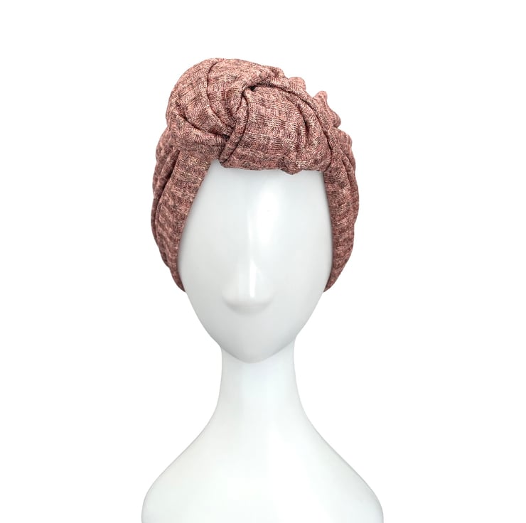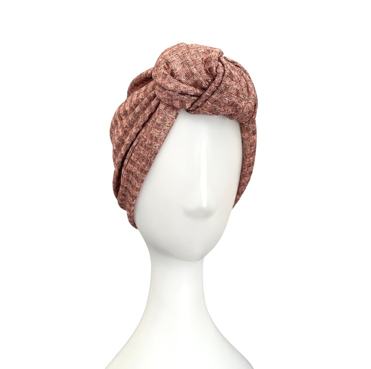 Shiny rose gold metallic fabric turban hat for women. This is a soft and stretchy double-layer design metallic jersey turban hat.