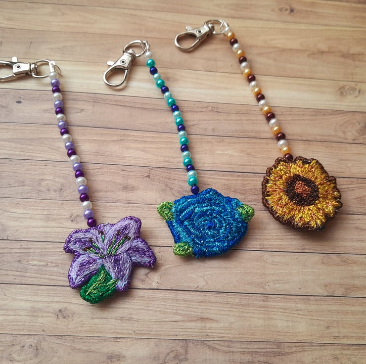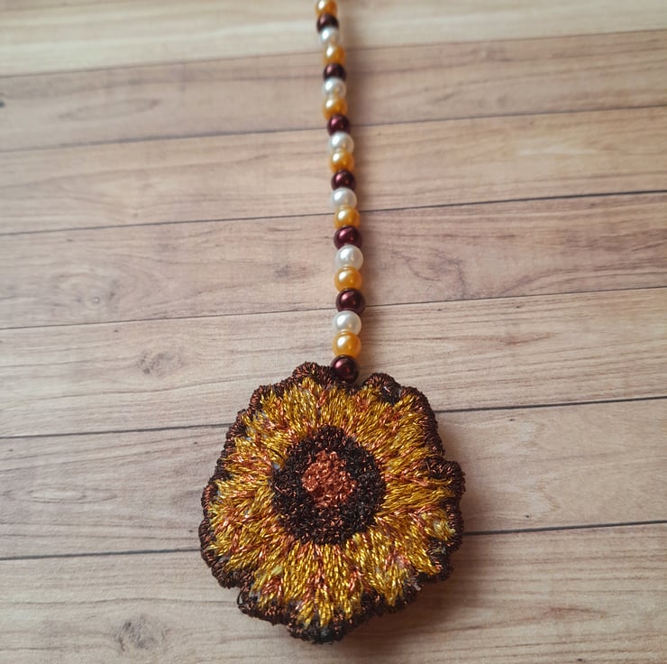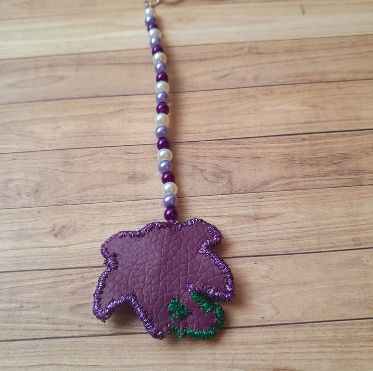 Embroidered with DMC Light Effect metallic thread and backed with faux leather. Attached with matching pearl beads and lobster claw clasp