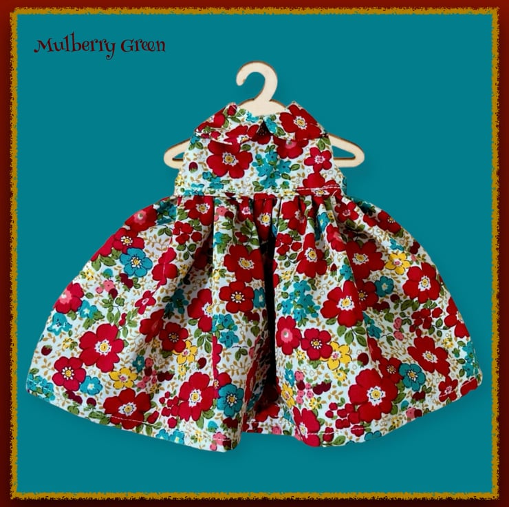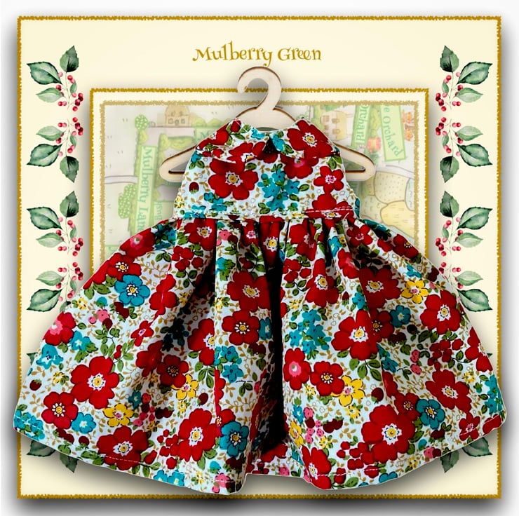 A pretty little dress in a floral print to fit the Mulberry Green characters. The dress is made from cotton and has a Peter Pan collar and a lined bodice.