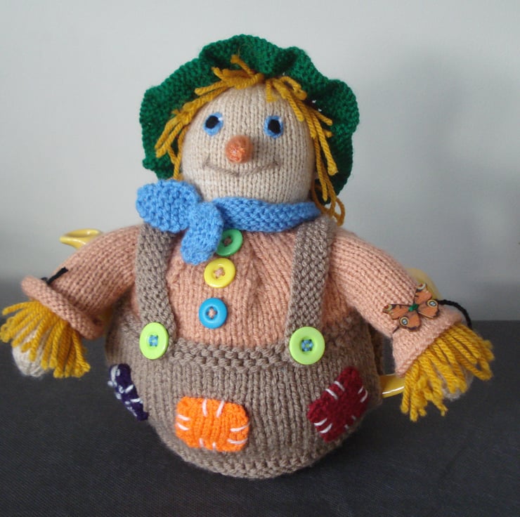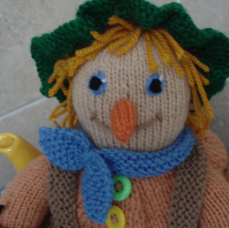 This is a hand knitted tea cosy which will fit a 4-6 cup teapot. The cozy is in the shape of a scarecrow with a hat, scarf and patches on his trousers. I will make him to order so the colours may differ a little from the picture shown. This is made using a Debi Birkin pattern.