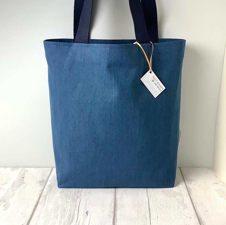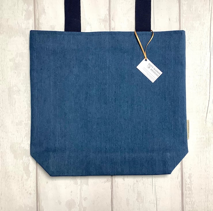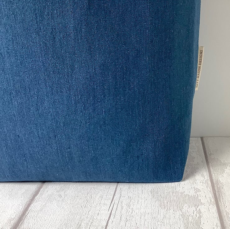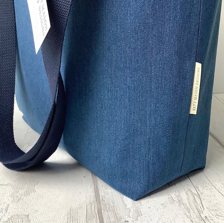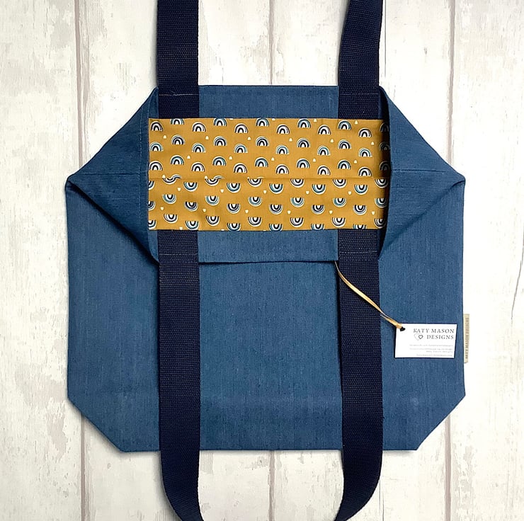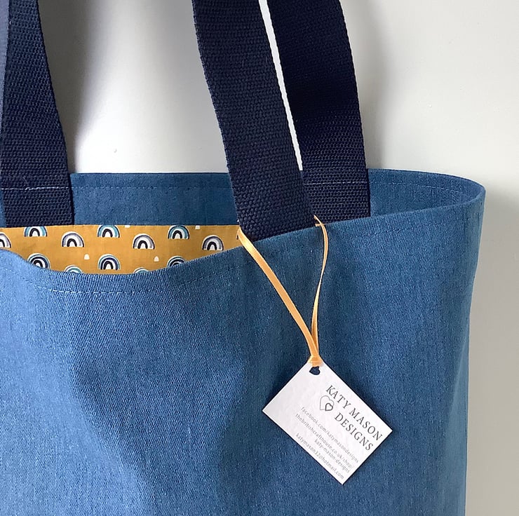 Tote bag made up in a mid blue denim with a pretty mustard yellow print lining with inside pocket. 38cm by 35cm by 12cm. Perfect for day trips, holidays, crafts.