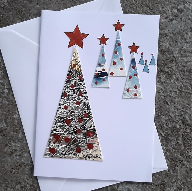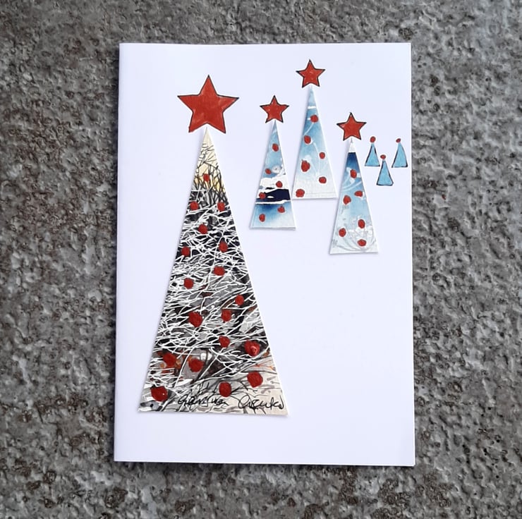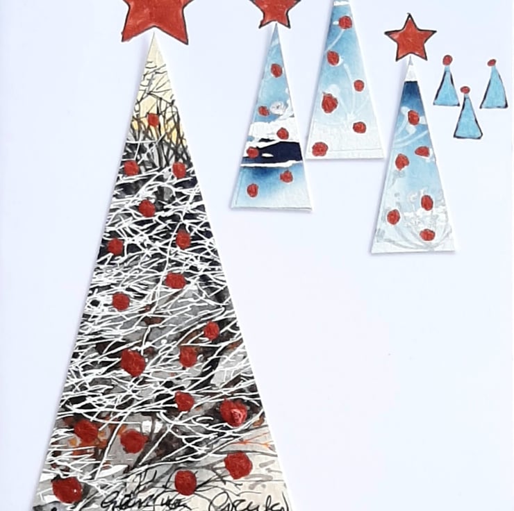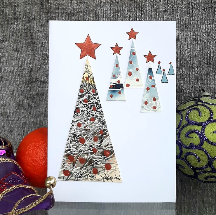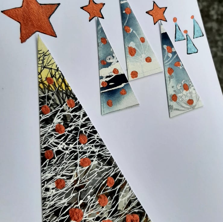Collaged handpainted Christmas trees with metallic copper paint