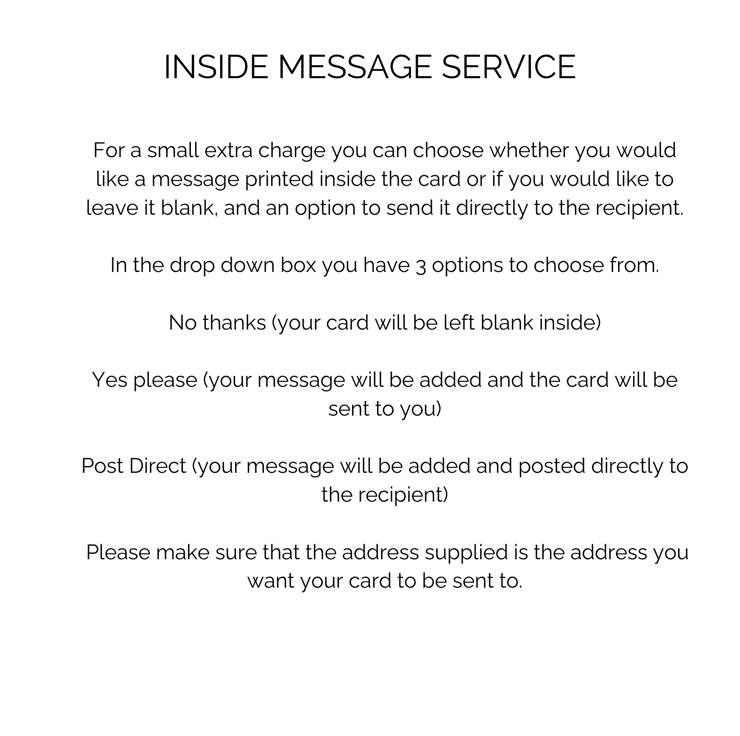 have your message printed inside and sent direct to recipient. Ensure the postal address supplied is that of the recipient.