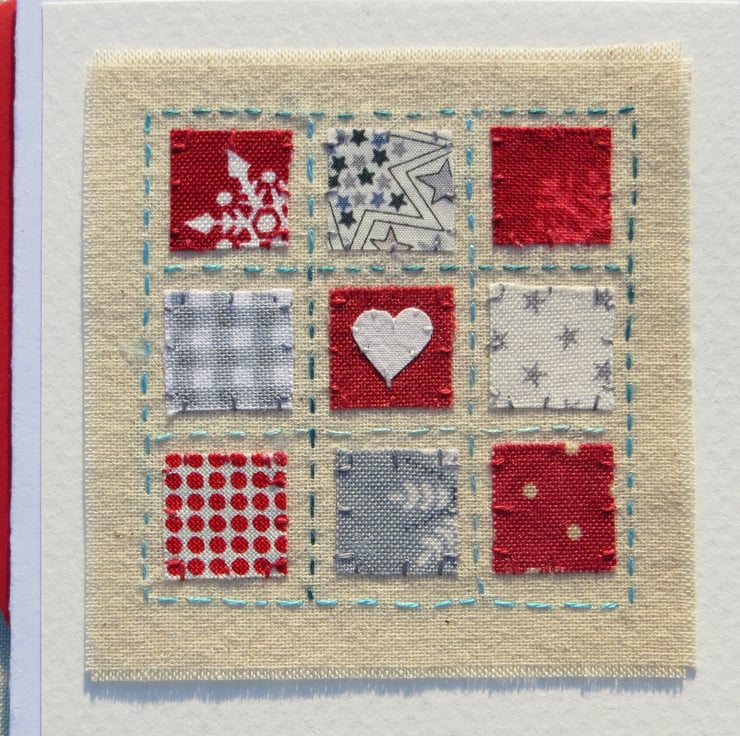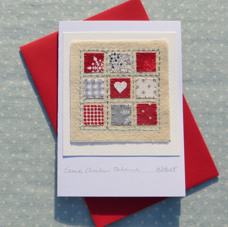 This is a small hand-made greeting card featuring a miniature hand-stitched applique 'patchwork' with white heart in the centre. Made using pretty cotton prints with intricately embroidered stitching. It is entitled 'Scandi Christmas Patchwork' a special little card to keep!