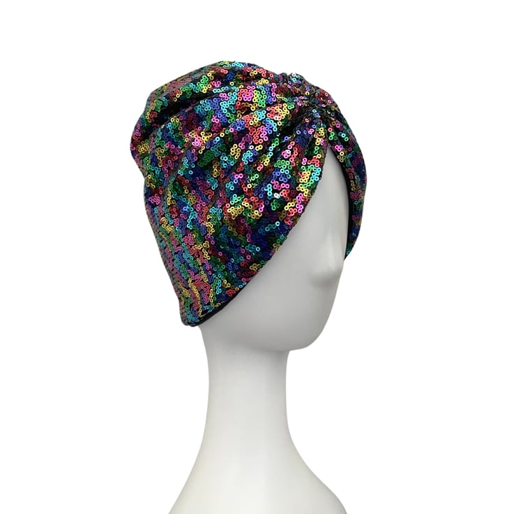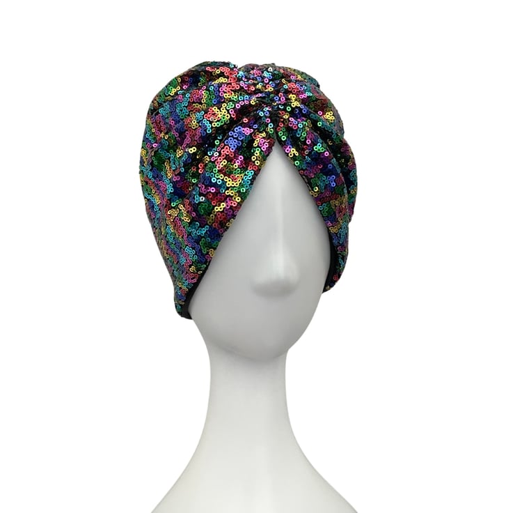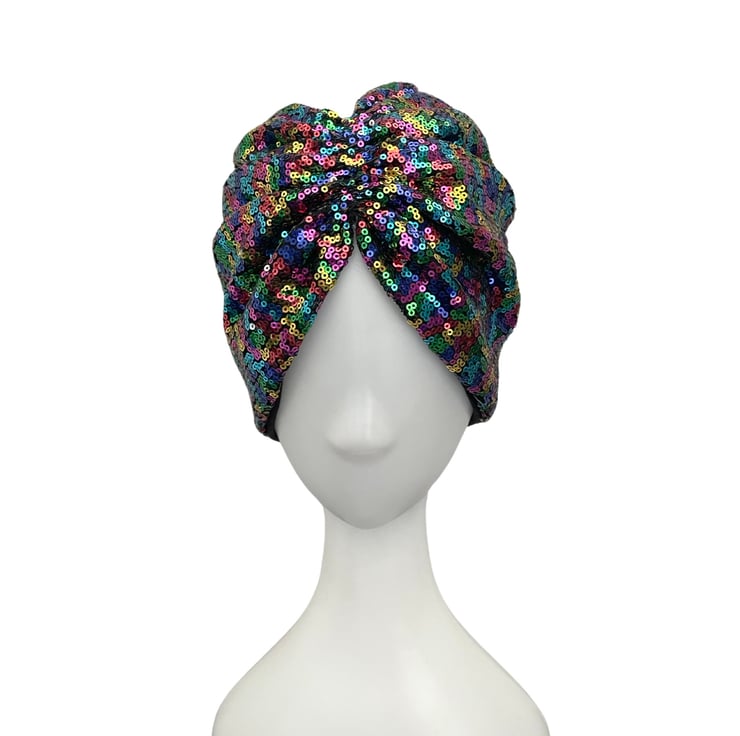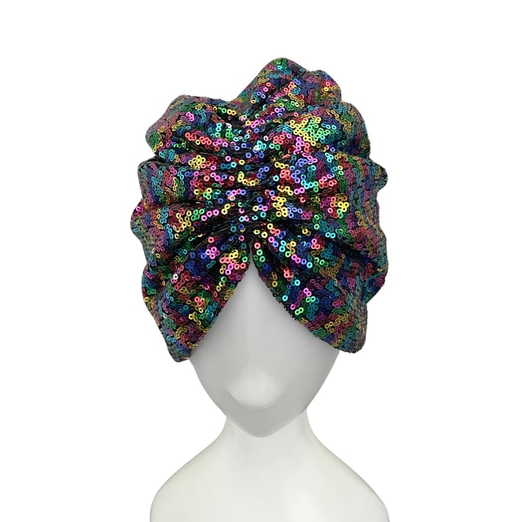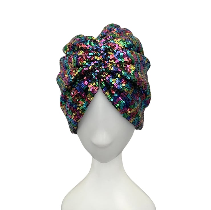 Introducing our colourful and sparkly rainbow sequin turban head wrap hat, the perfect accessory to add some glamour and sophistication to your look. Made with high-quality, stretchy fabric that is comfortable to wear, this turban head wrap is designed to provide full coverage to your head while also adding a touch of sparkle to your outfit.
