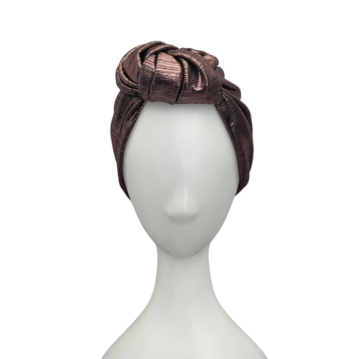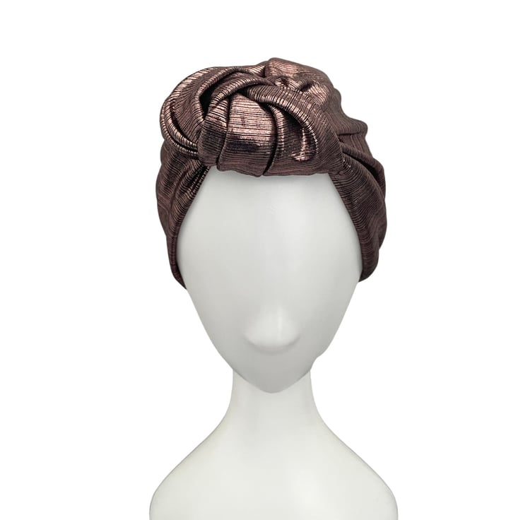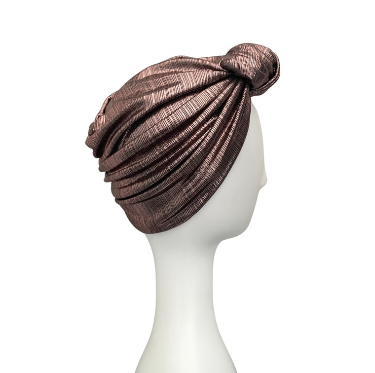 Shiny rose gold metallic fabric turban hat for women. This is a soft and stretchy double-layer design metallic jersey turban hat.
