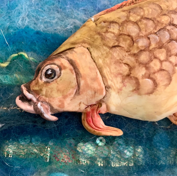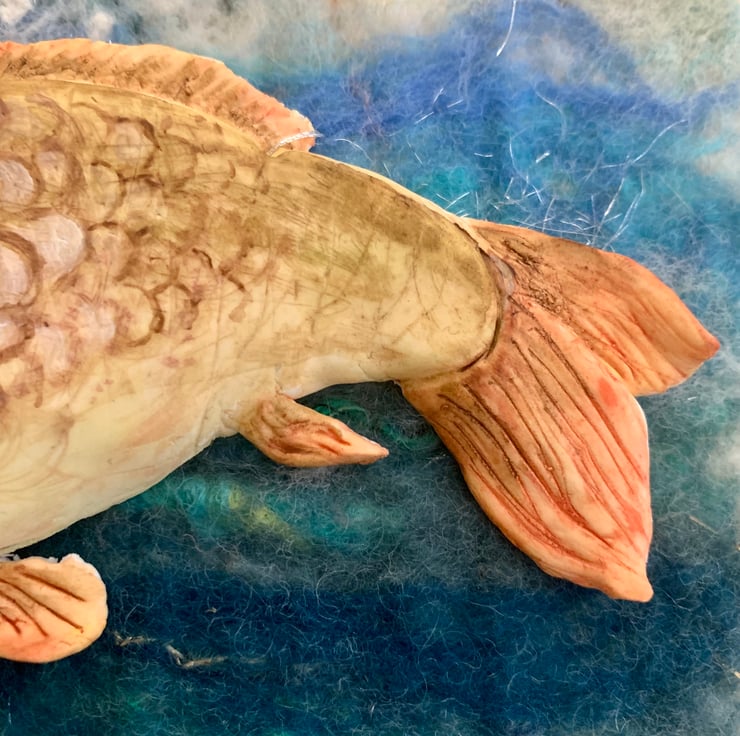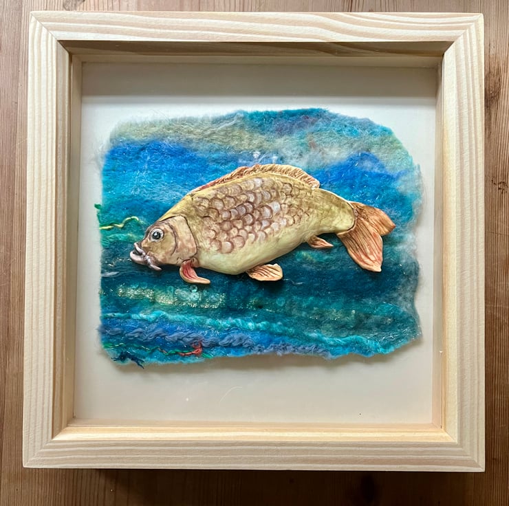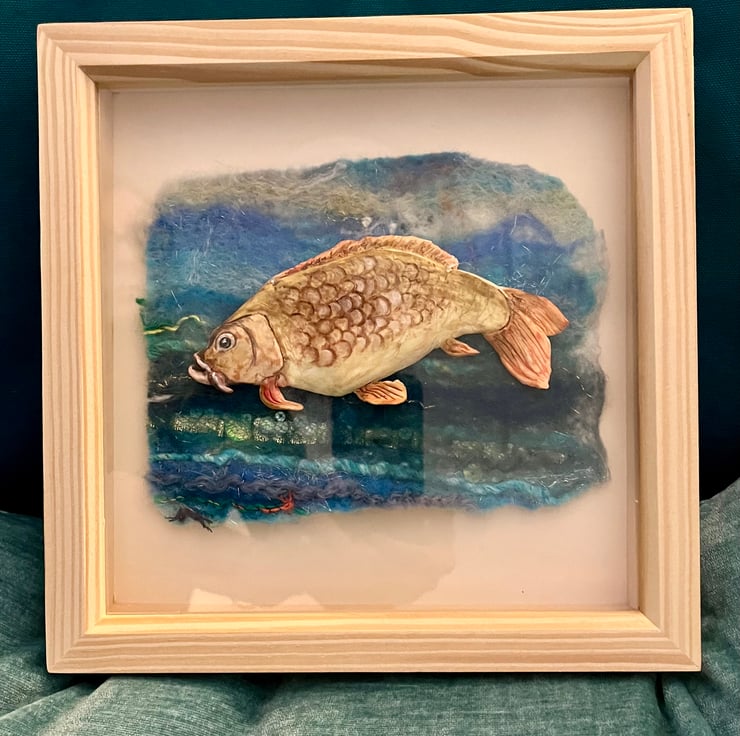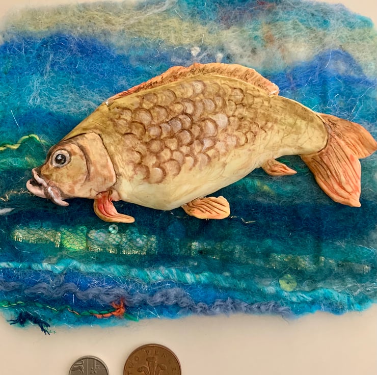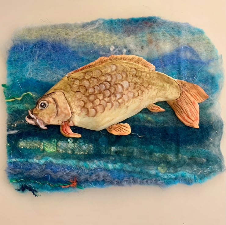 The carp is hand sculpted from polymer clay and painted in acrylic. He is hand stitched onto a wet-felted background of merino wool and sparkles.