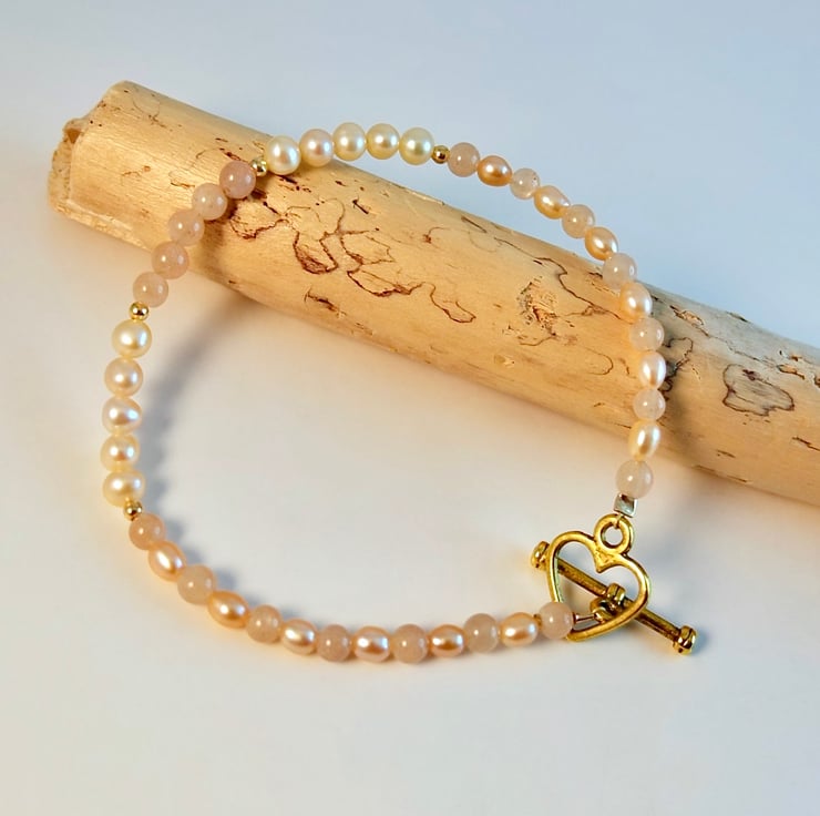 The Sunstone beads are a light peach-brown colour, while the Freshwater Pearls are several shades paler, with a more creamy pink-peach colour.