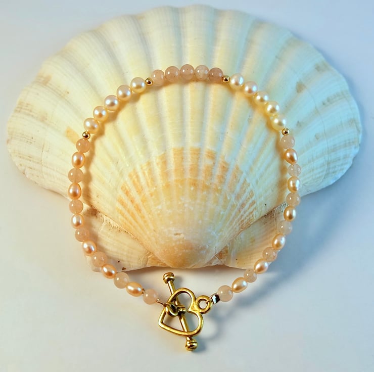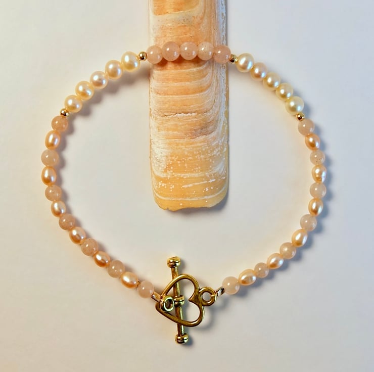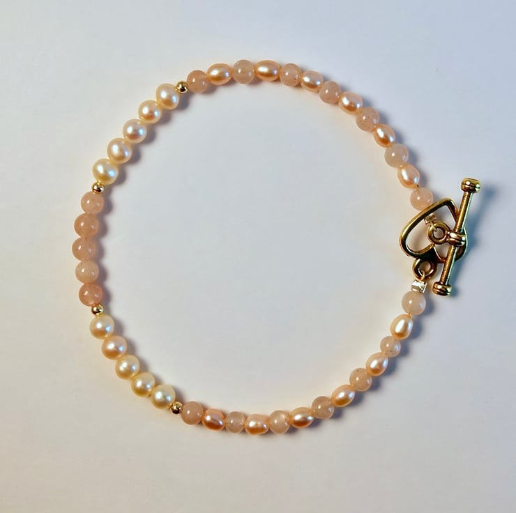 The centre of the bracelet features five 4mm Sunstone beads with a row of five 4mm Freshwater potato Pearls to either side, separated by 2mm gold vermeil spacer beads.