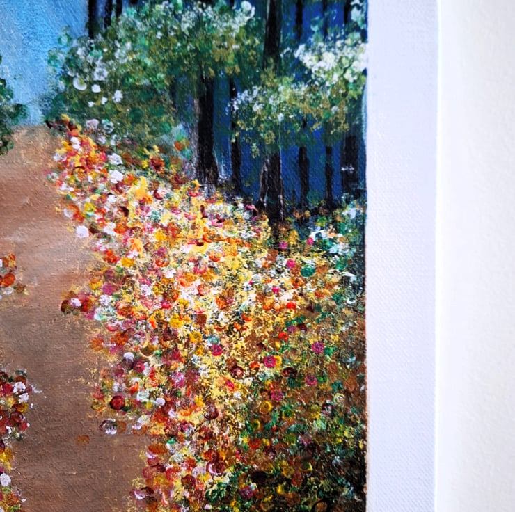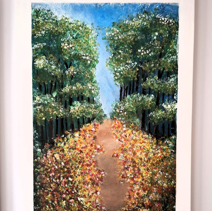 For this painting I had fun using a couple of household items. To give texture to the petals I bound together about 10 cotton buds with tape, then dabbed them into my paint and dotted them on the canvas creating petals and depth to the painting. I used a kitchen sponge to blend the paint for the sky, and to blend the path and ground underneath the blossom trees. A simple but effective way of creating a beautiful scene.