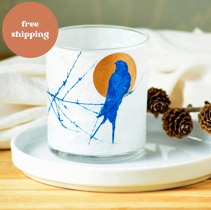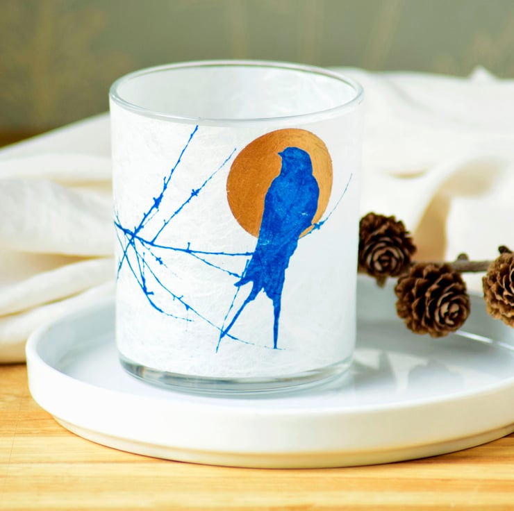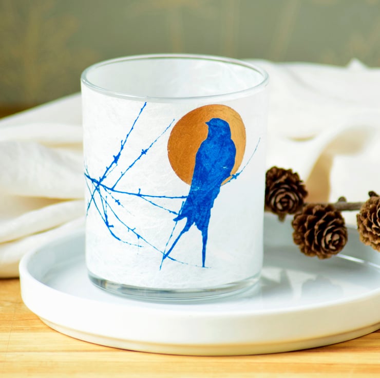 The distinctive silhouette of a Swallow resting on a branch is captured on this contemporary candle holder. The hand painted gold circle creates a luxurious feel to this candle holder, evoking the light of a setting sun behind the bird silhouette. When the candle is lit the light flickers through bringing the image to life!