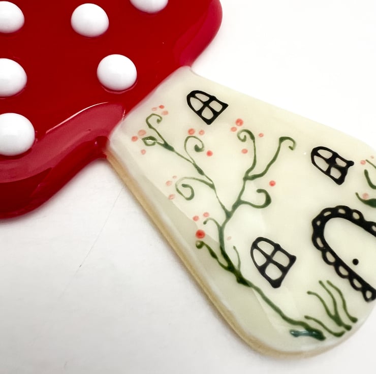 To make this toadstool, I hand cut toadstool shapes from opaque and transparent art glass and fused them overnight in my kiln. The next day, I added the handpainted design with enamel paint. Then, I added white fused glass dots to the roof of the toadstool. The decoration then goes back into the kiln again to tack fuse dots. This time, the kiln is set on a lower temperature so dots are slightly proud from the glass, giving it a 3D effect.