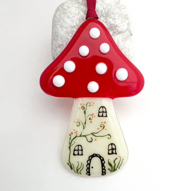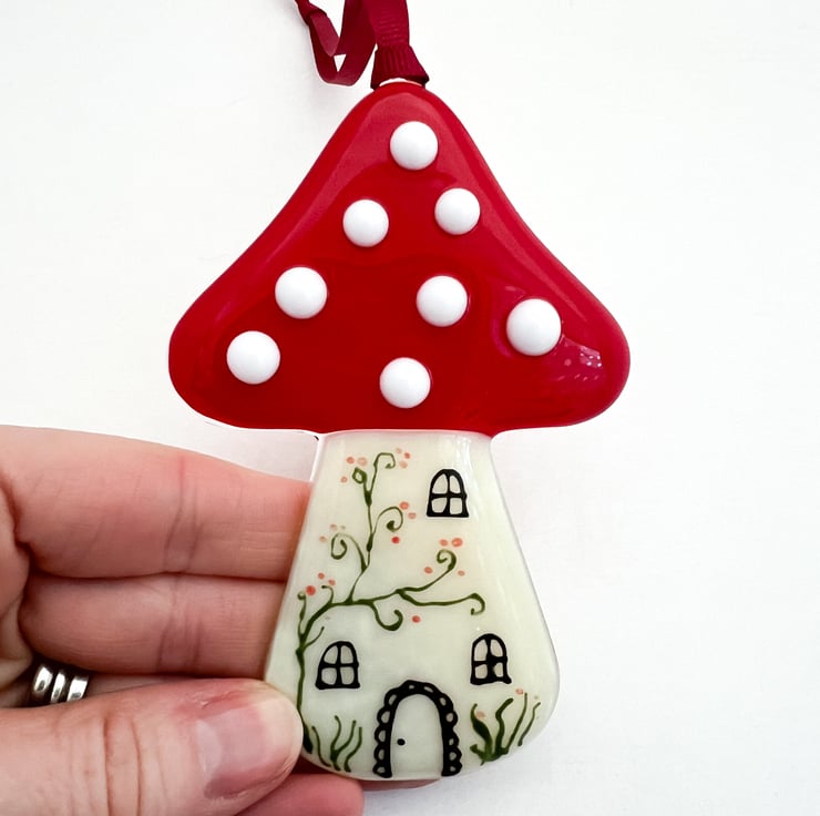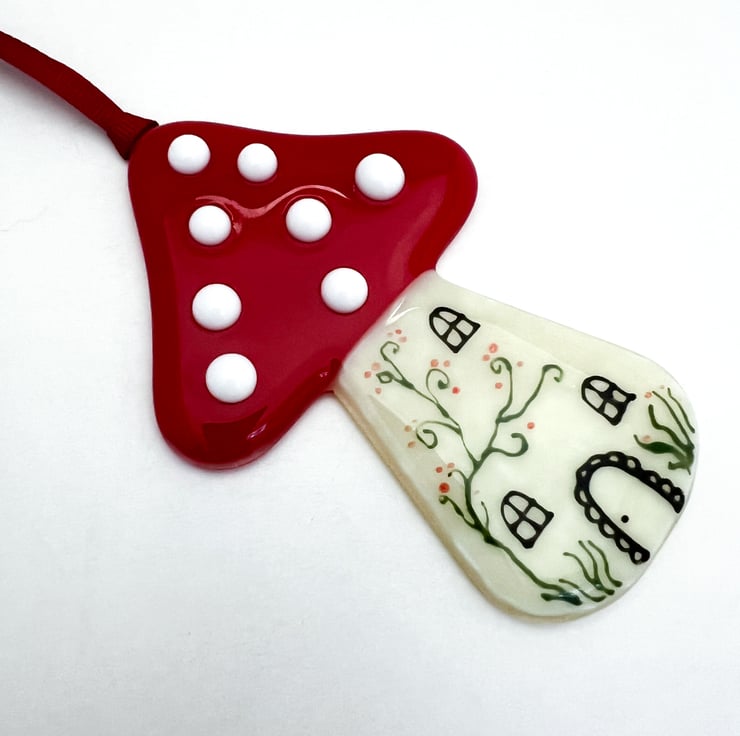 Fused glass fairy toadstool decoration. These toadstools are handmade for opaque red and cream art glass with a hand painted decorated design. They look lovely on a Christmas tree and make a wonderful postable gift.