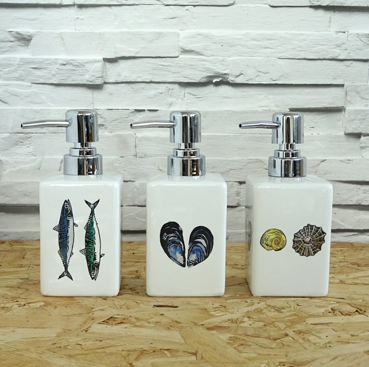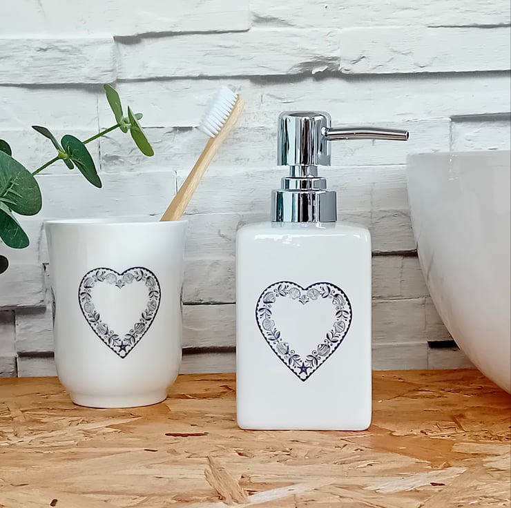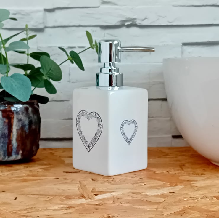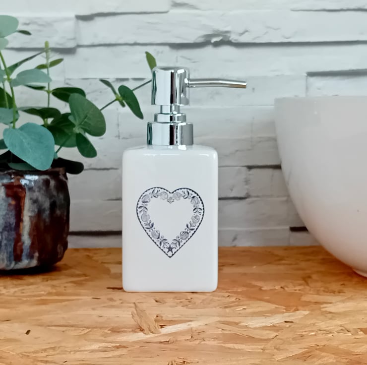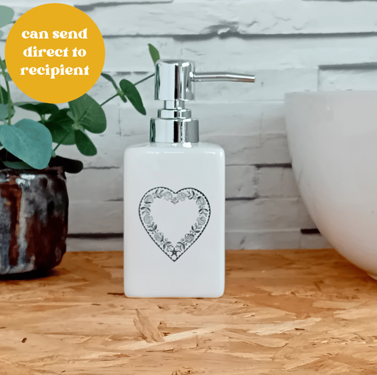 This stylish white ceramic pump dispenser is decorated around the outside with a lino cut coastal scandi heart design. Look closely and you can see little shells and starfish within the heart. It’s ideal for liquid soap, shampoo or lotion, and will bring a coastal feel to any bathroom, to remind everyone of days at the sea.
