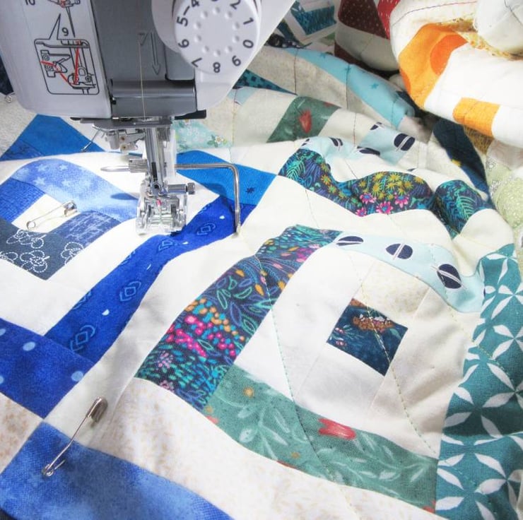 The three layers of the throw (top, wadding and back) are held together by radiating arcs of quilting stitches. I’ve used a rainbow thread so the arc shape and the changing colours of the thread echo the rainbow theme of this quilt.