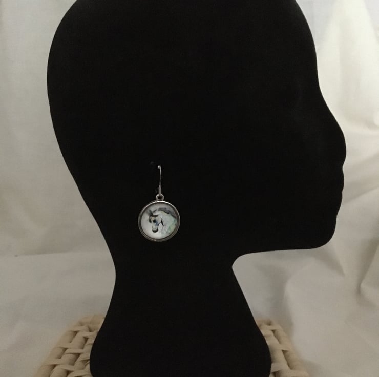 The unicorn print is set under the clear dome before being positioned in the earring setting. The earrings measure just under 1in with a total drop of 1.5in.