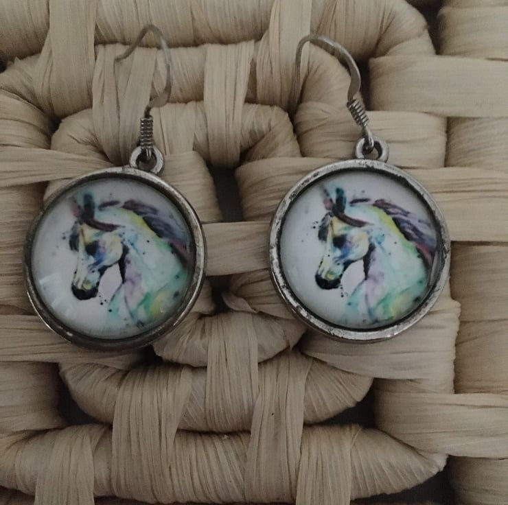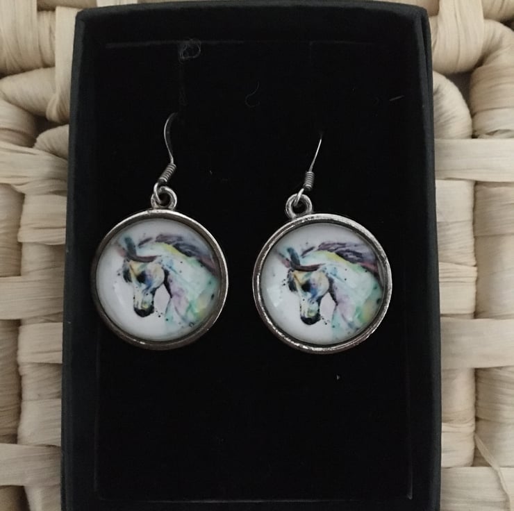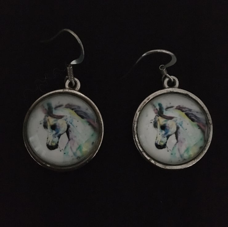The unicorn print is set under the clear dome before being positioned in the earring setting. The earrings measure just under 1in with a total drop of 1.5in.