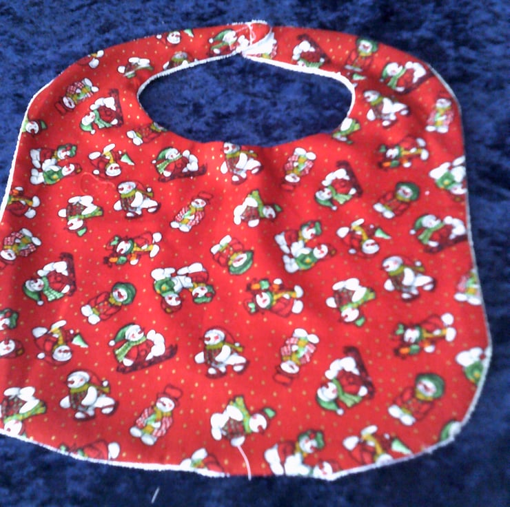 The design on the fabric used is of playful snowmen skiing, skating along with being dressed up on a red background. It is backed with Stretch Terry Towelling with a Velcro fastening at the neck so it is easy to put on and take off before and after feeding baby.