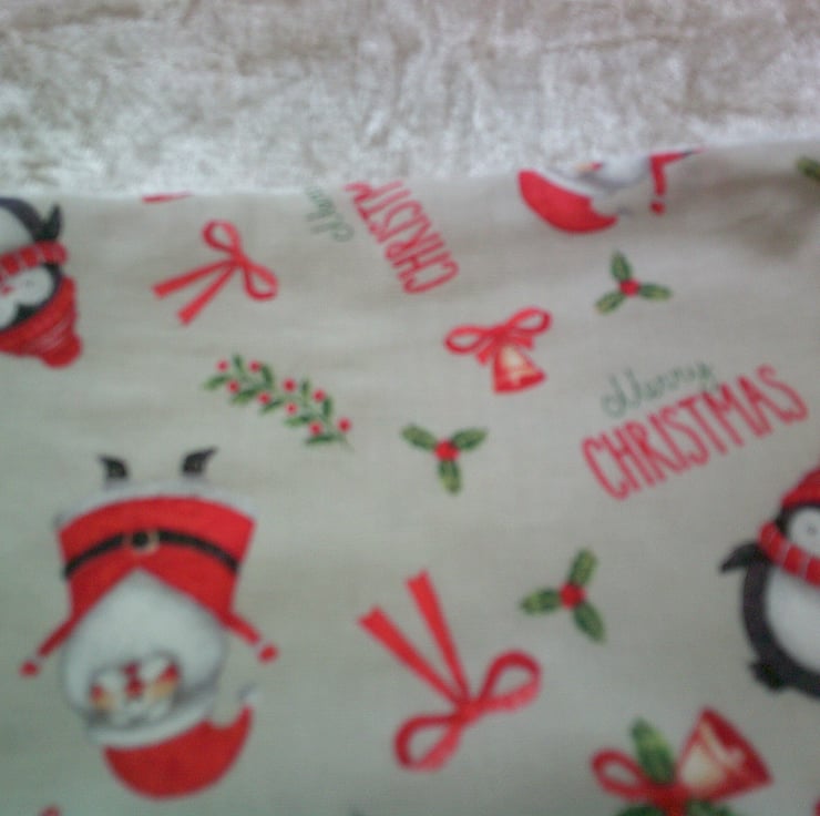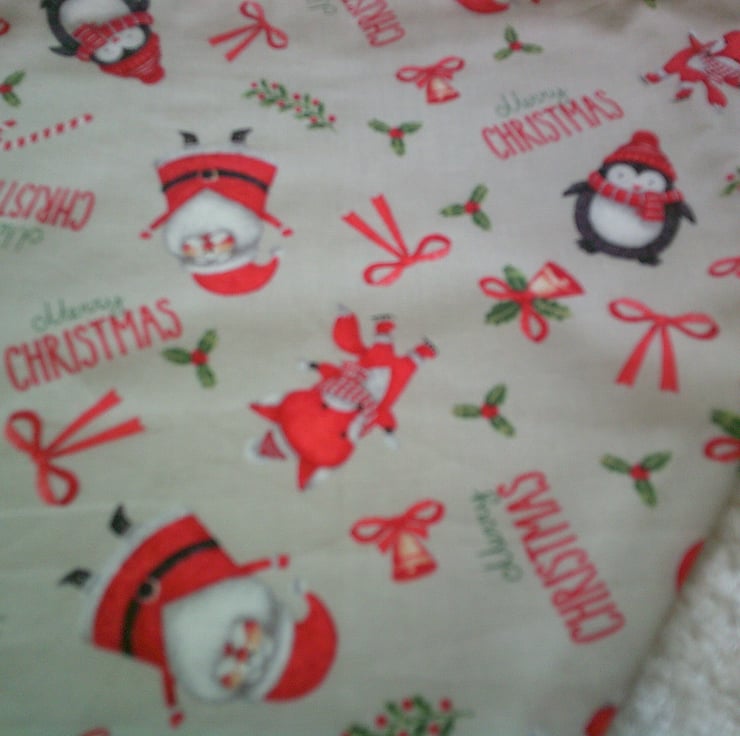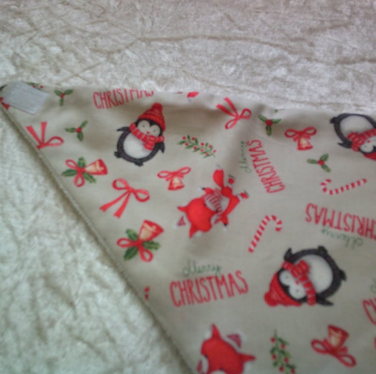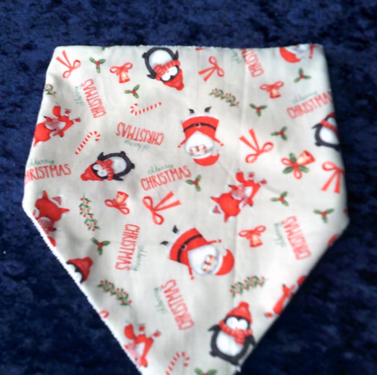 The fabric used for this dribble bib is of Santa, Penguins and Foxes with bells, bows and the wording Merry Christmas on a pale grey background.