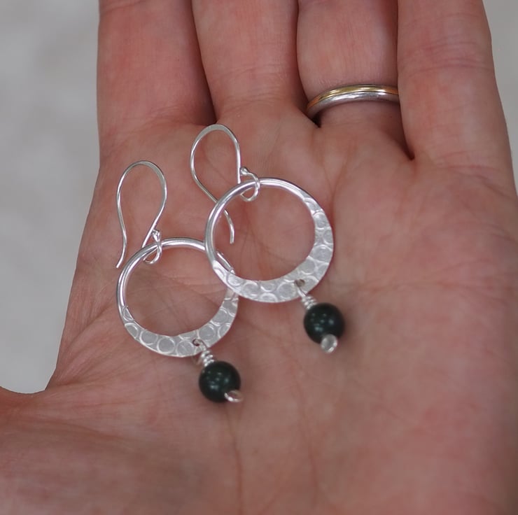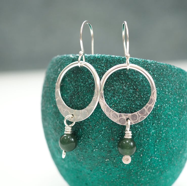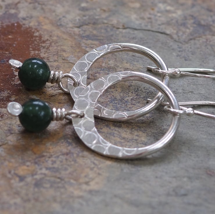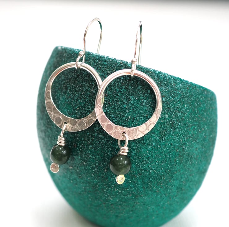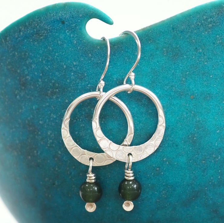 A hoop of Argentium silver has been flattened on one side and punched with little rings to add a lovely abstract surface pattern. I've added a dark green moss agate bead to the flattened bottom of the hoop.