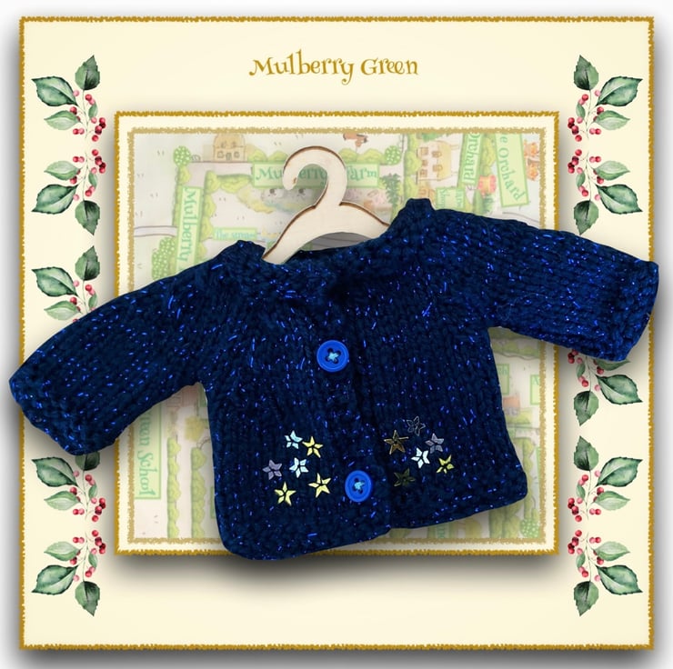 A lovely little dark blue cardigan decorated with little stars, to fit the Mulberry Green characters. The cardigan is hand knitted in sparkly yarn.