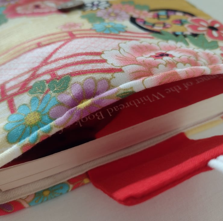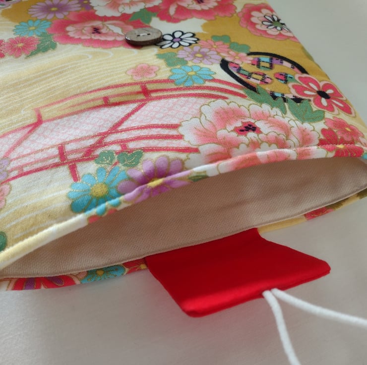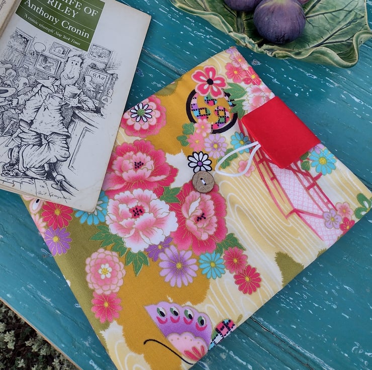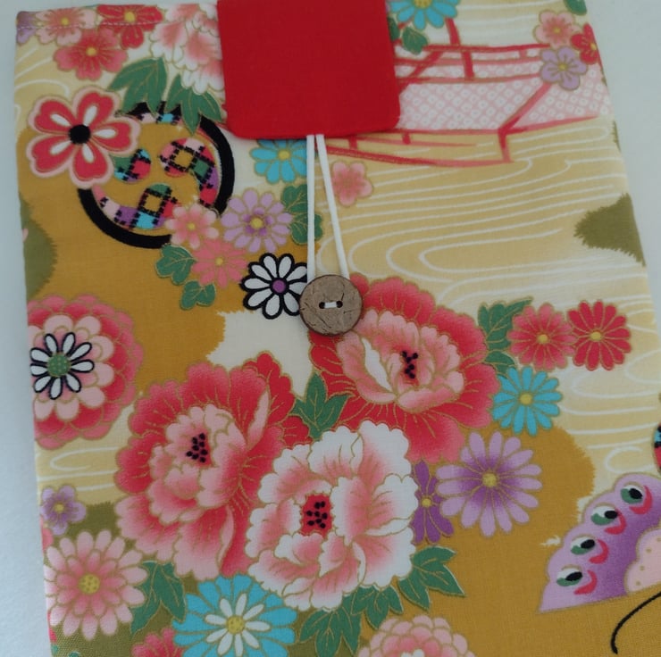 A soft, pretty, book sleeve for keeping books clean, crease and damage free. It is made of a Japanese inspired patterned cotton poplin outer layer, the same fabric front and back. The interior layer is cream cotton fabric and sandwiched between the two is a layer of soft polyester wadding. At the open end is a red coloured tab which folds over the book keeping it contained and is fastened on the front by an elastic loop around a wooden button. The sleeve measures 7x9 inches, 18x23cms. Suitable for paperbacks, small hardbacks and appropriate sized kindles.