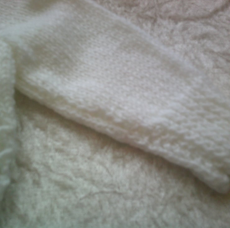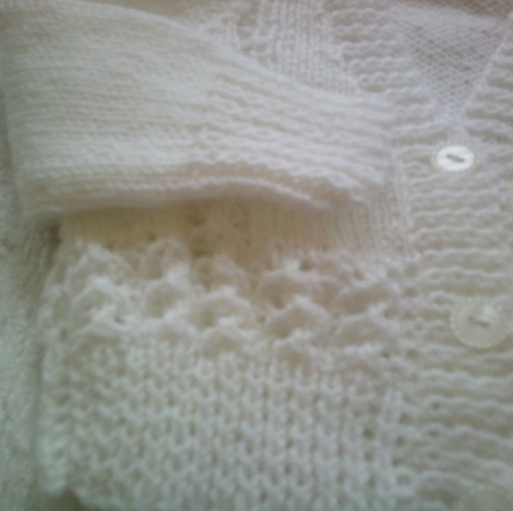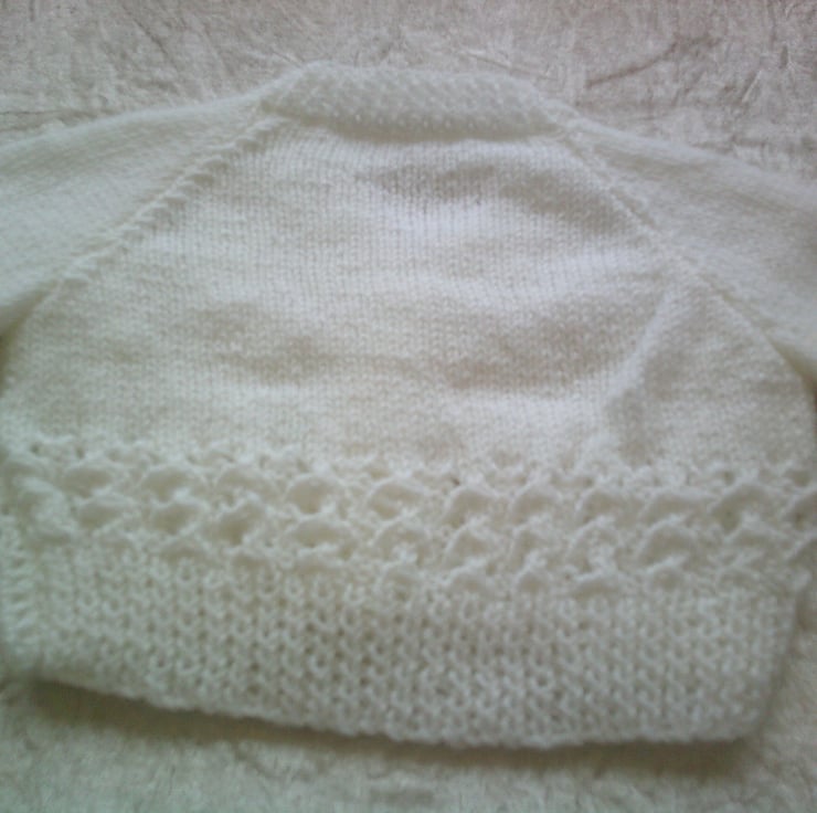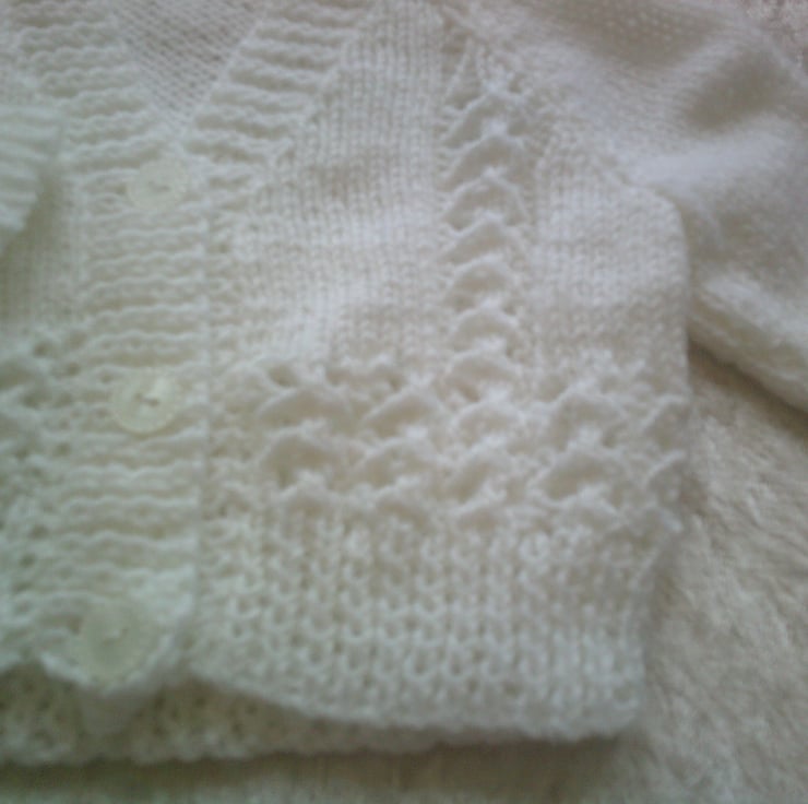This hand knitted White V Neck cardigan is made using acrylic yarn and a design of lacy ladders around the bottom and up the fronts and would make a lovely addition to a babies wardrobe.
