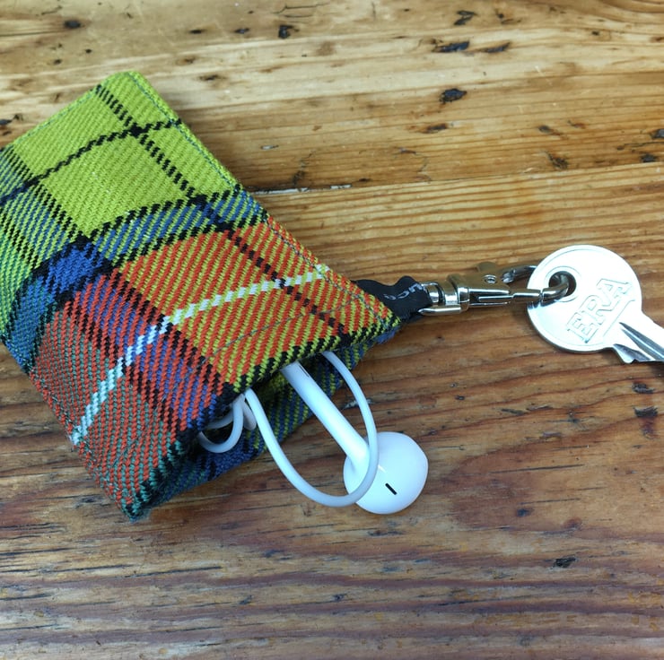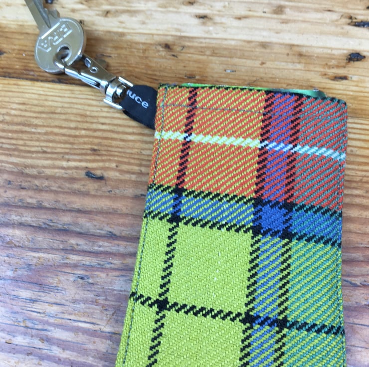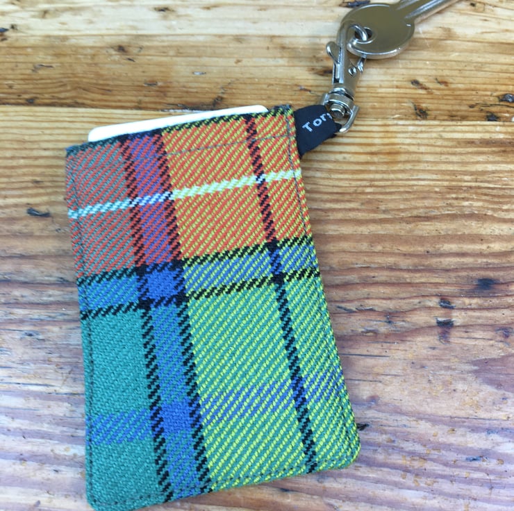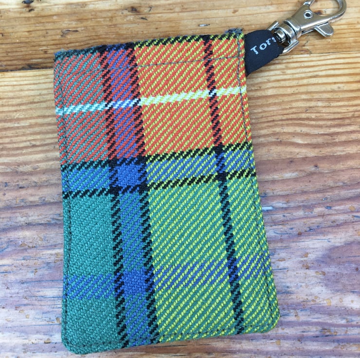 A fun and stylish card holder with a practical key clip in a vibrant tartan wool kilt fabric.