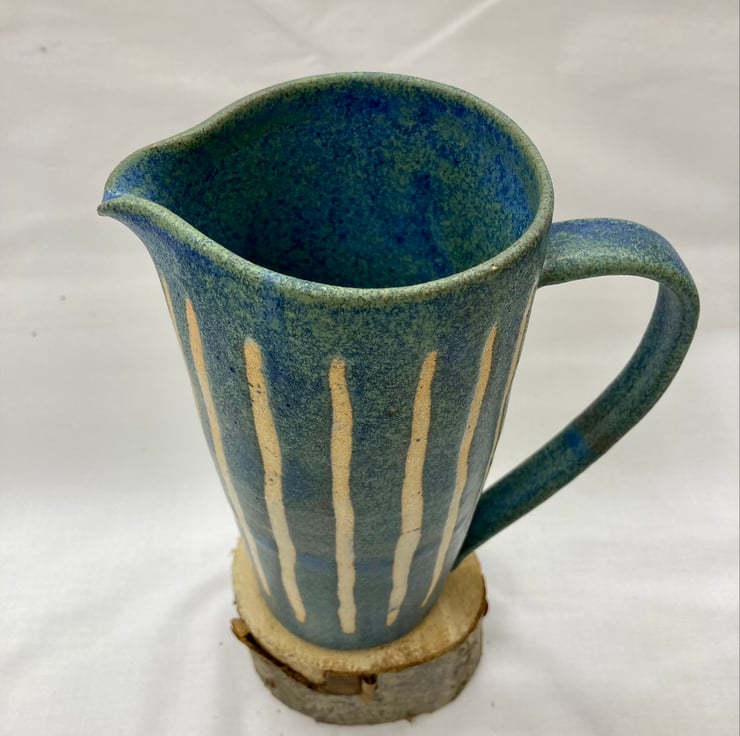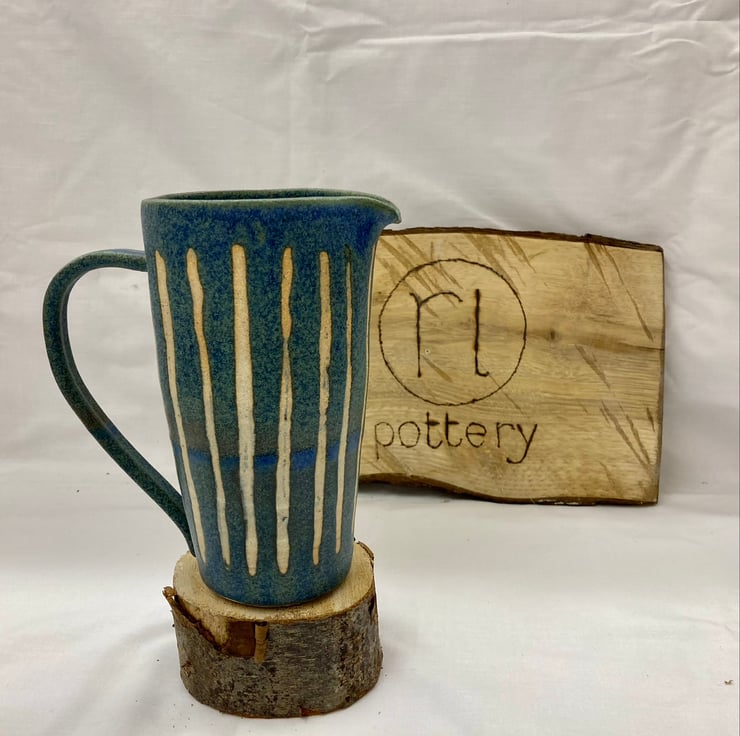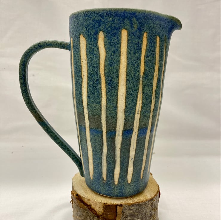 Here is a shapely tall blue Jug, suitable for both pouring liquids such as gravy or cream or fruit juice, but also good for a vase. Its decorated with a blue glaze with bare white stoneware stripes. The glaze is blue and breaks to a lovely sea green.