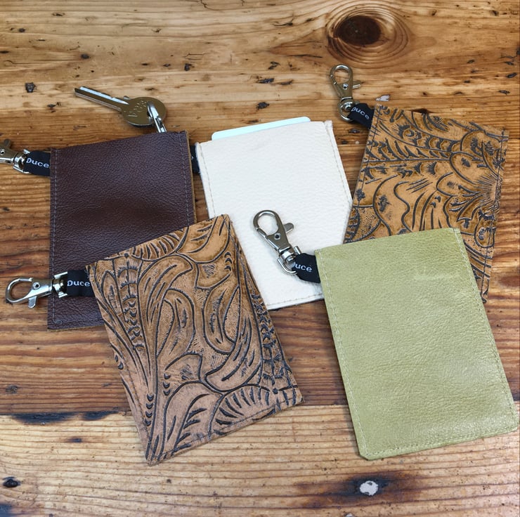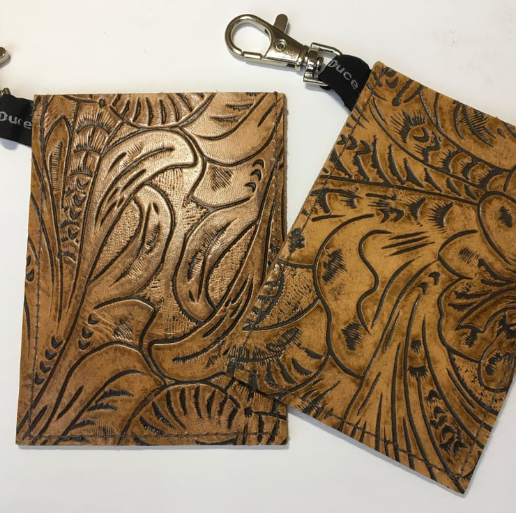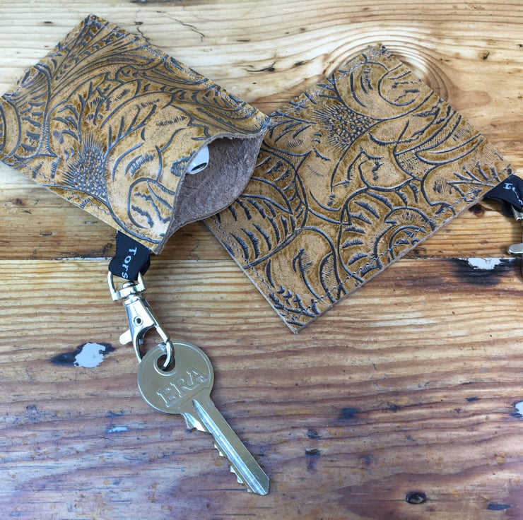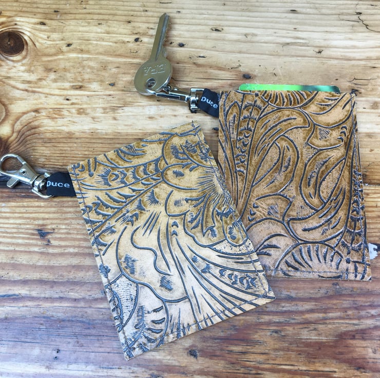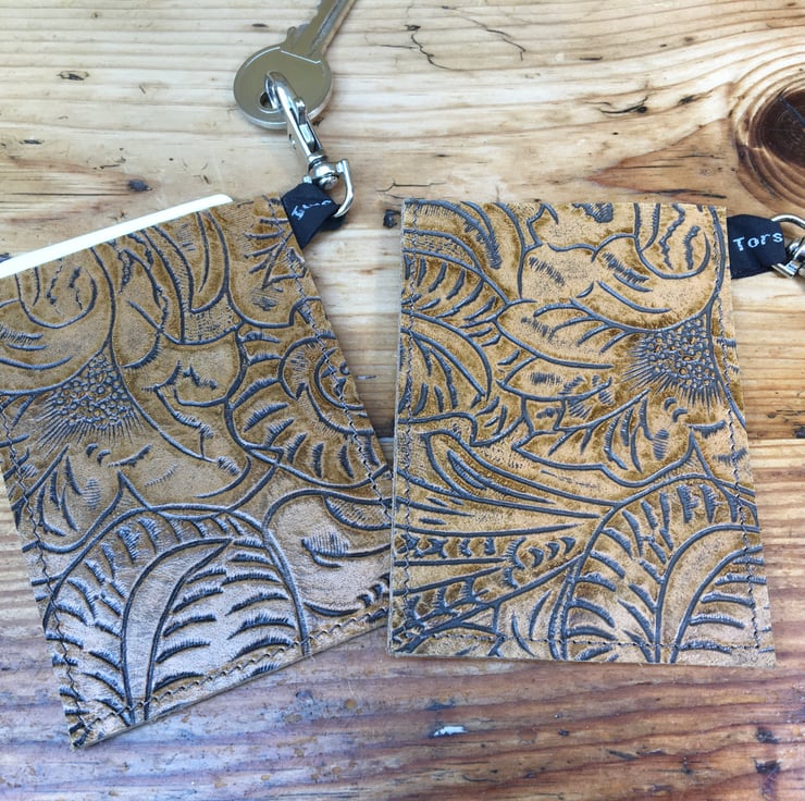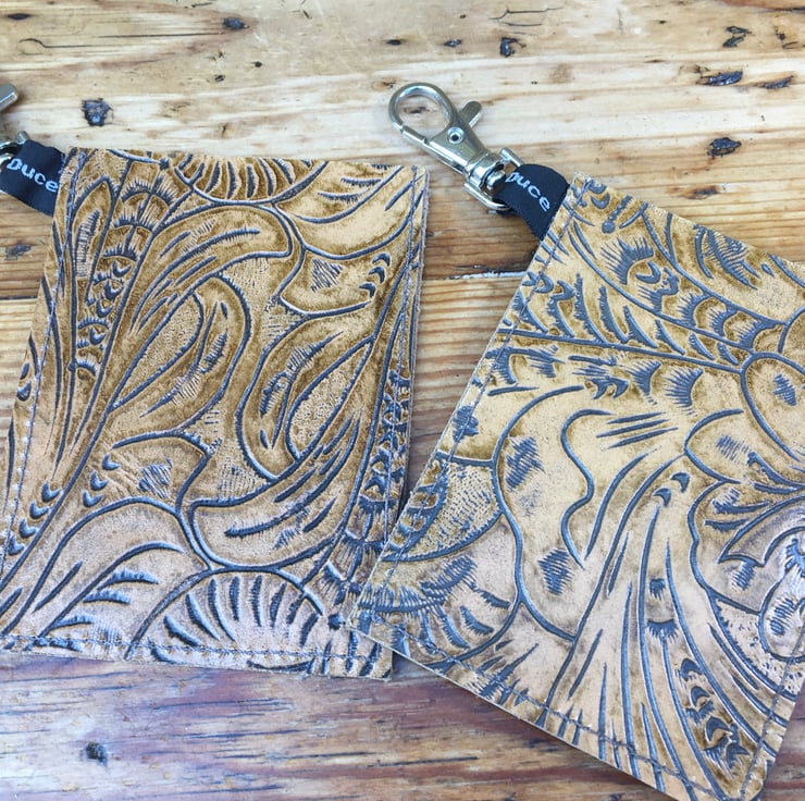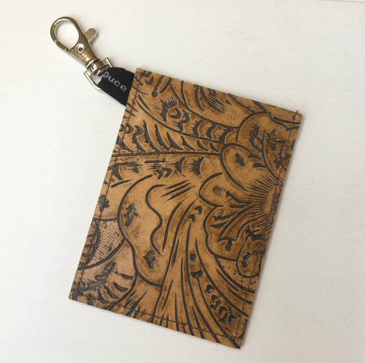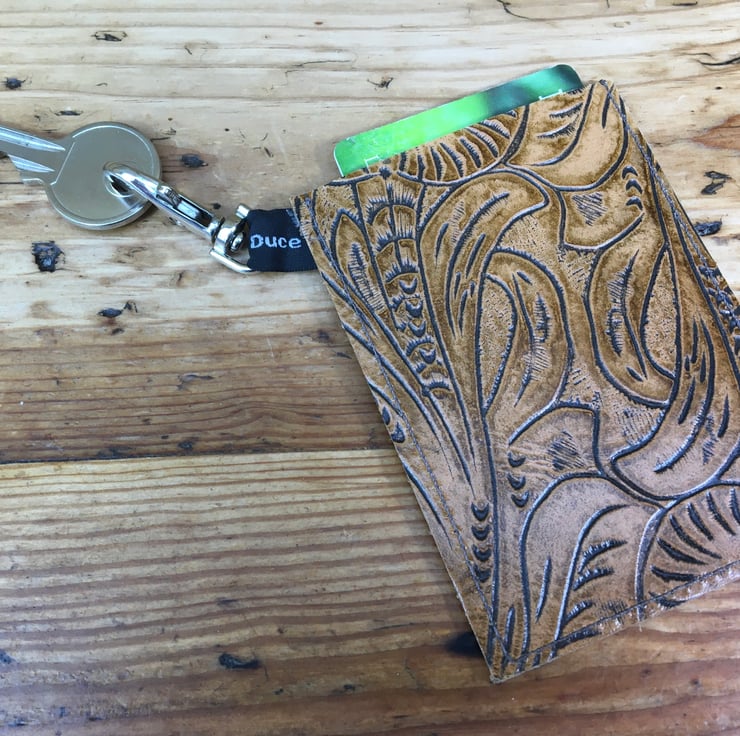 A luxurious patterned caramel brown leather card holder with a practical key clip. Ideal for travel passes, Oyster card, identity card etc. It can also be used to hold earphones.