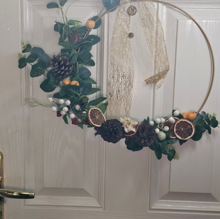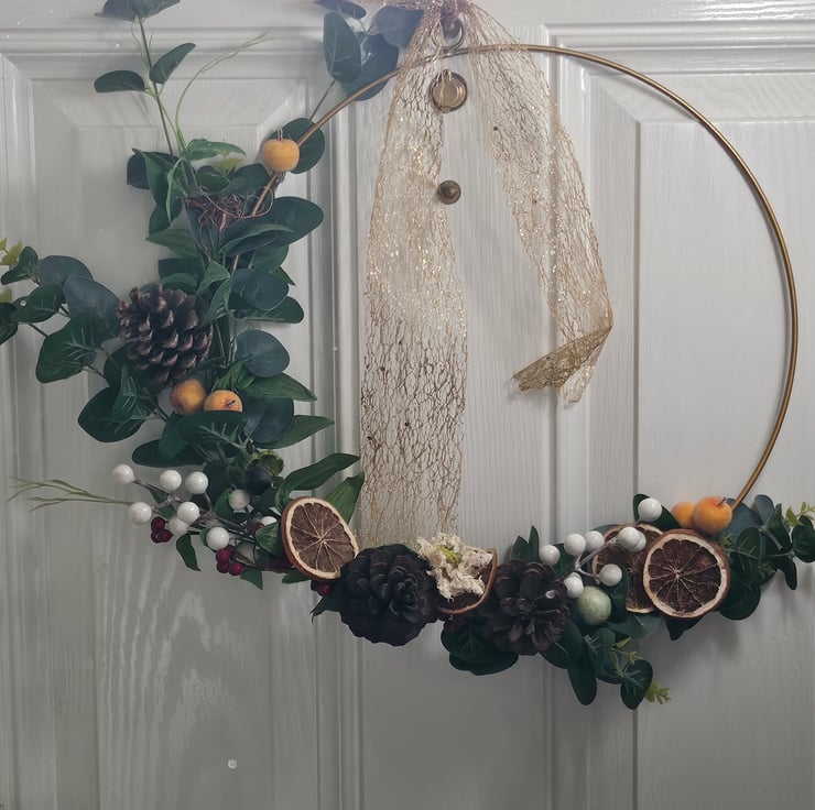 Beautiful Christmas golden hoop wreath decorated with artificial eucalyptus sprays, real pine cones, scented orange slices, artificial mistletoe berries