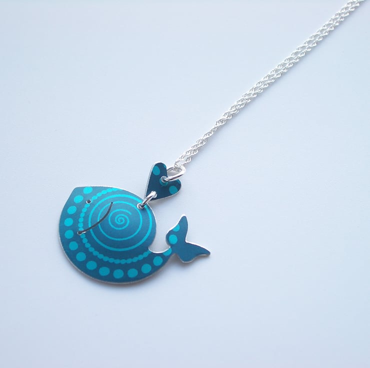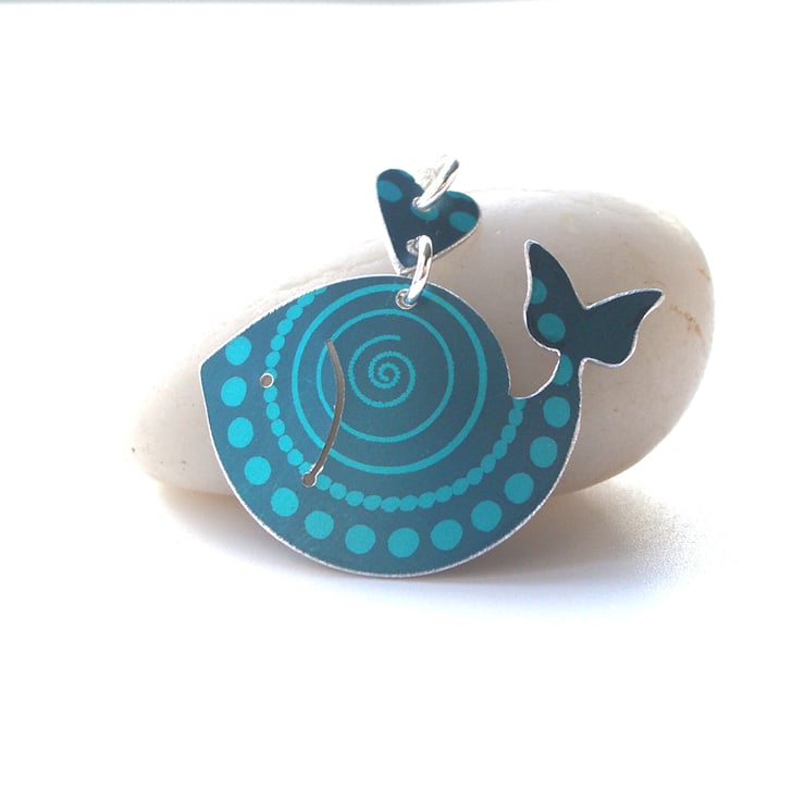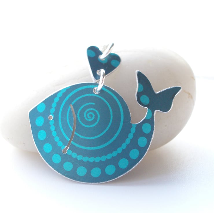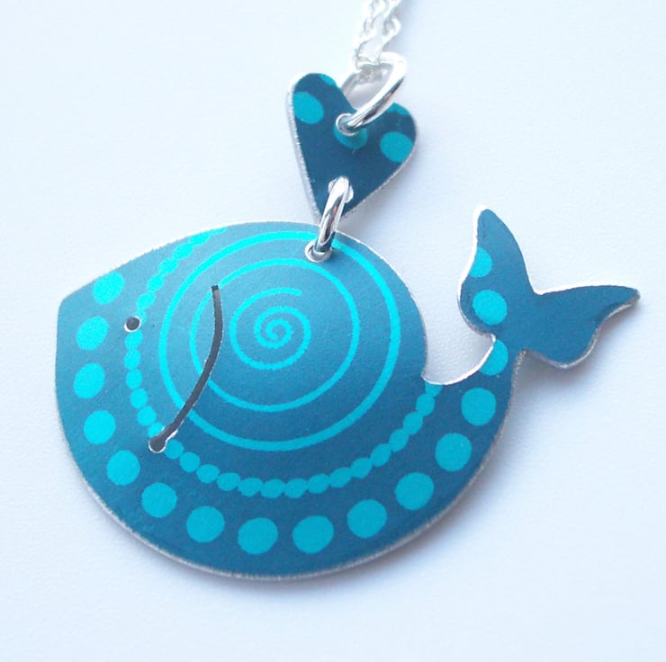 This cute little pendant is hand made from anodised aluminium which I have dyed in a blue and turquoise mix and printed with a spiral pattern. I then seal it so that the dye becomes a permanent part of the metal. I have saw pierced out the whale shape by hand, filing the edges so that there is a silvery outline. I have added a small blue heart which compliments the colour on the whale.