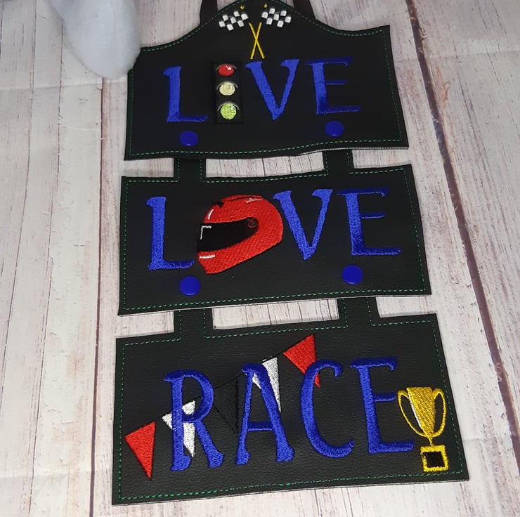 Does your man love racing well if hes lucky enough to have a man cave why not decorate it with this for him made from faux leather and embroidered and measures 13 1/2 inches long with snap tabs