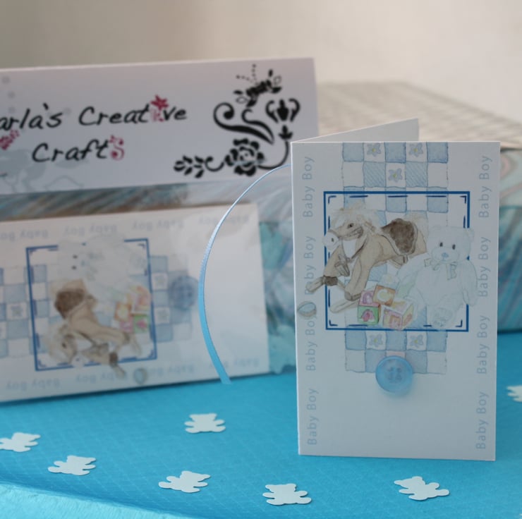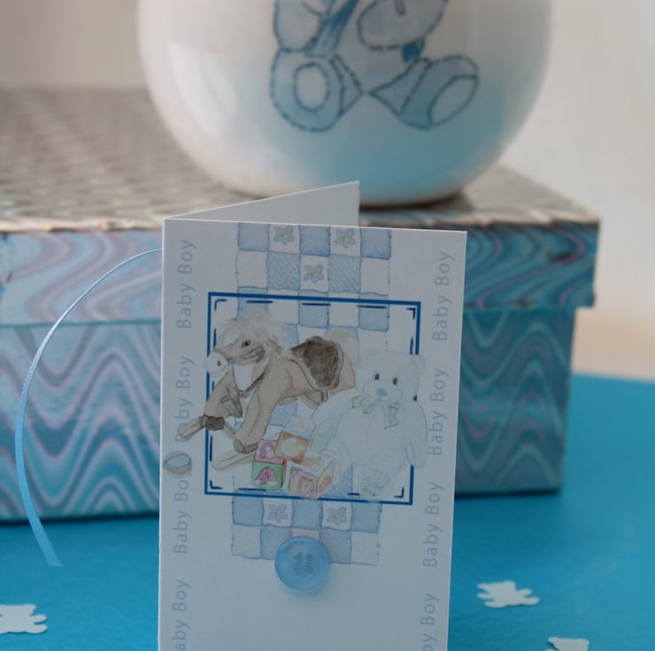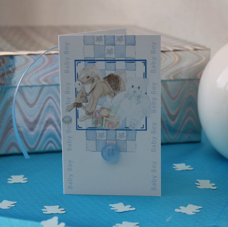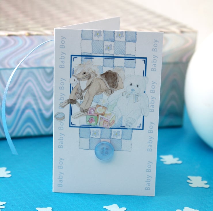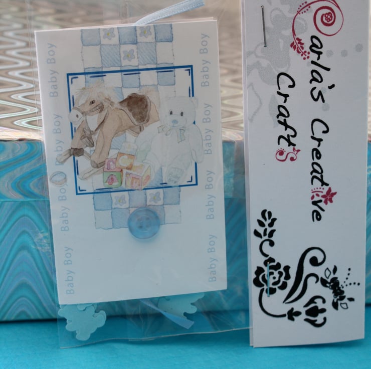 Beautiful hand crafted baby boy gift tag & confetti, made just for you. Each set includes a gift tag with a very cute blue button and my watercolour design of a rocking horse and teddy bear. The tag measures approximately 9cm in height and 5.5cm in width. The tag comes with a baby blue ribbon to attach to your gift/gift bag.