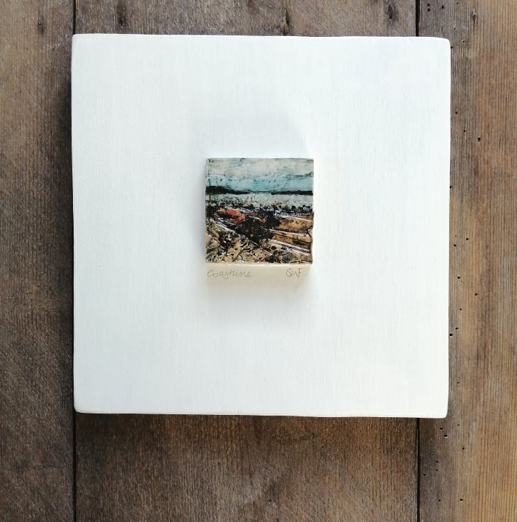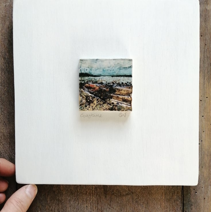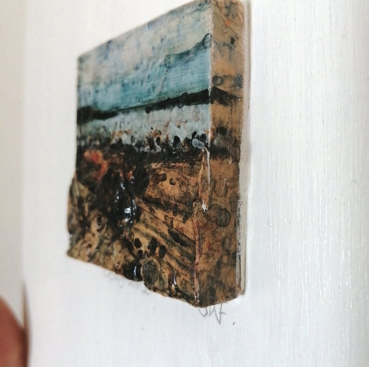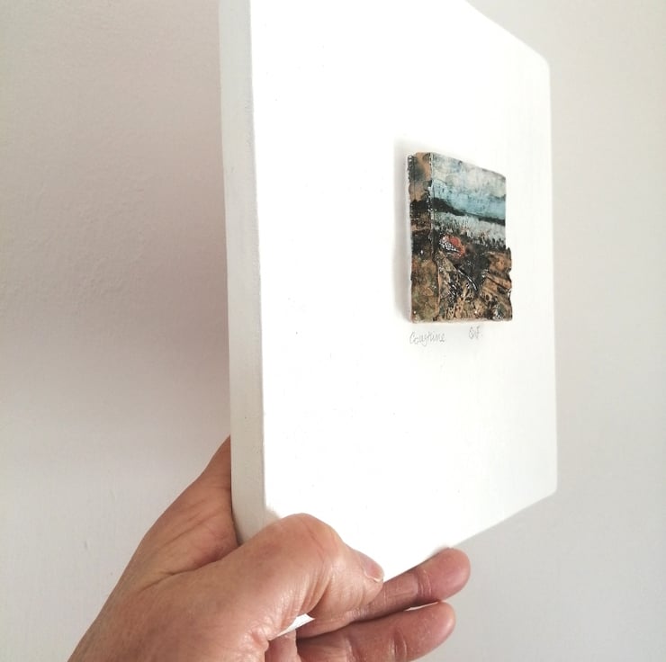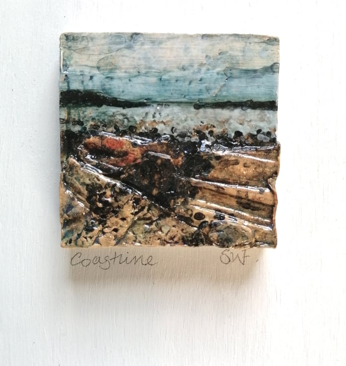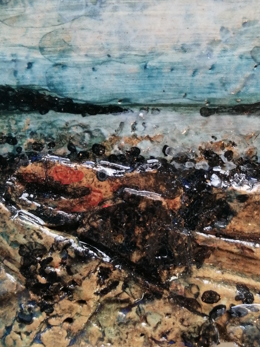 This ceramic, low relief landscape, the smaller version of my larger ones. Has been created by applying and layering clay textures, stamping and scratching into the wet clay, before painting liquid clay slips onto areas, starting to define areas of sea and sky.