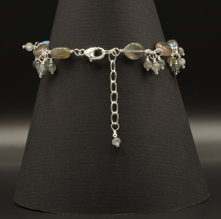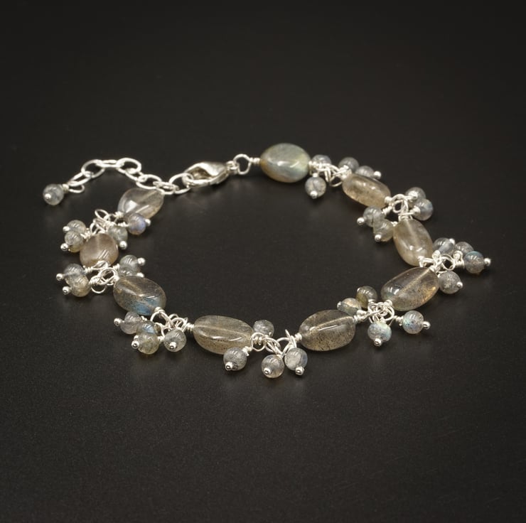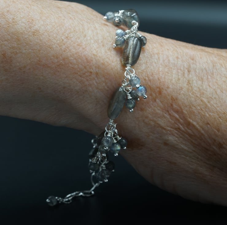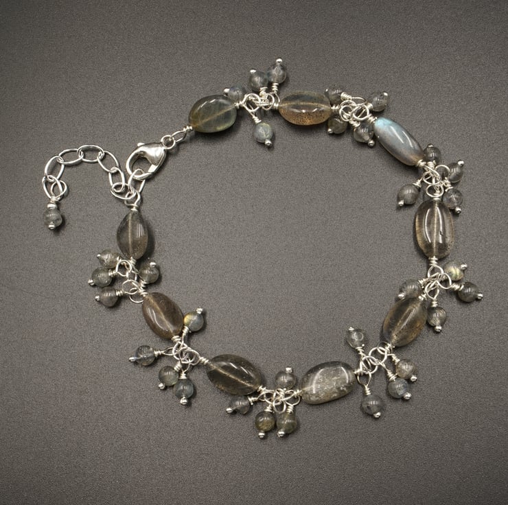 8 x5mm smooth oval beads of labradorite are hand wrapped onto individual links of fine sterling silver wire to create this dainty bracelet. There are lots of lovely blue flashes in these stones. In between these ovals are clusters of matching 3mm round labradorite beads.