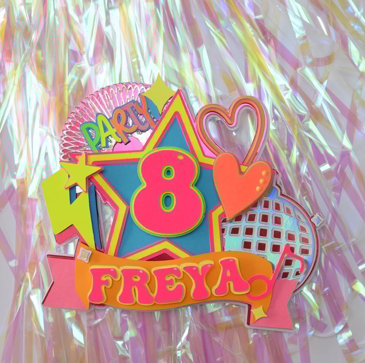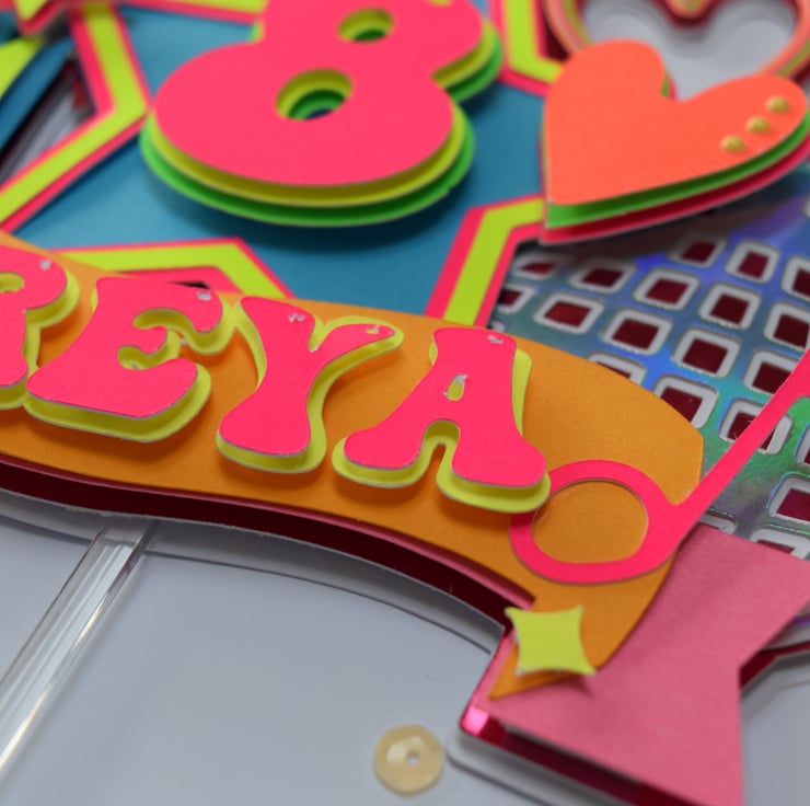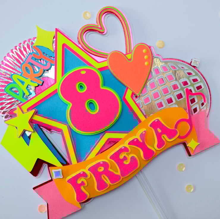 Add a pop of colour and fun to your cake with our Neon Cake Topper. With bright neon colours that glow under UV light, this cake topper is perfect for the birthday party, hen parties or other event. great for GLOW parties, laser tag parties, bowling parties and bowling parties too.