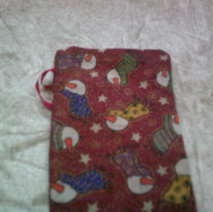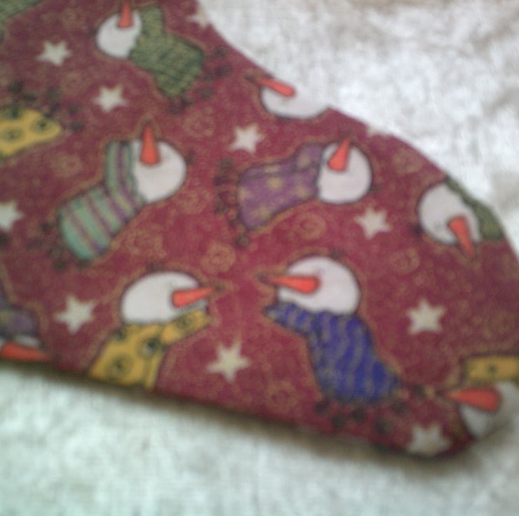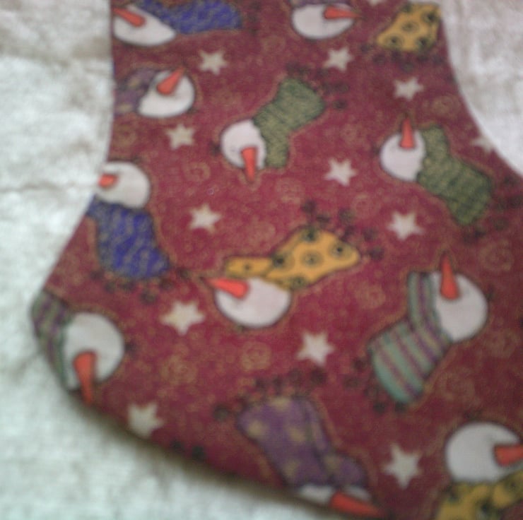 The fabric used is of snowmen heads with scarves and carrot noses on a burgundy background. The reverse side is the same design