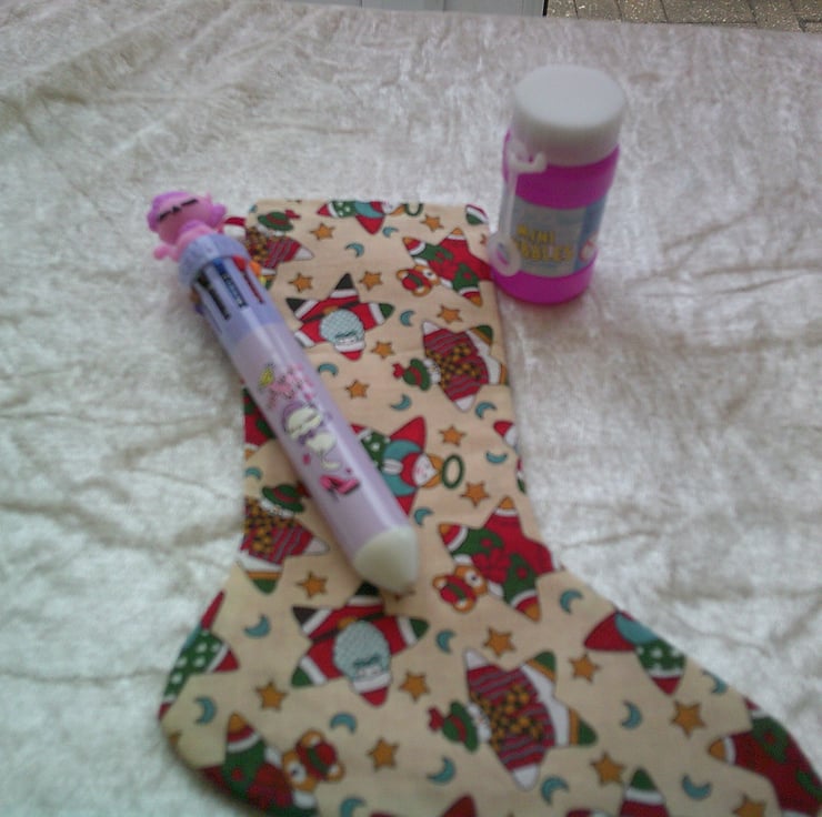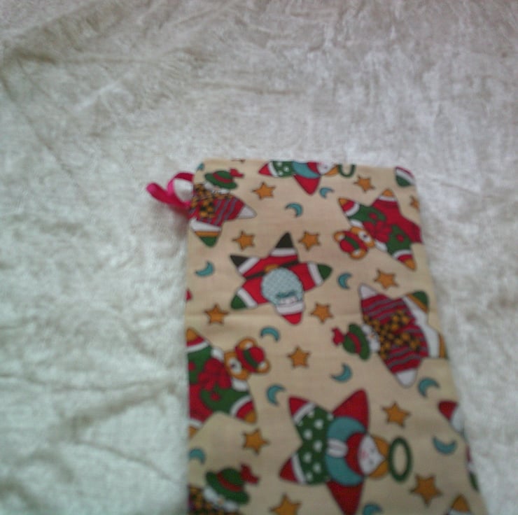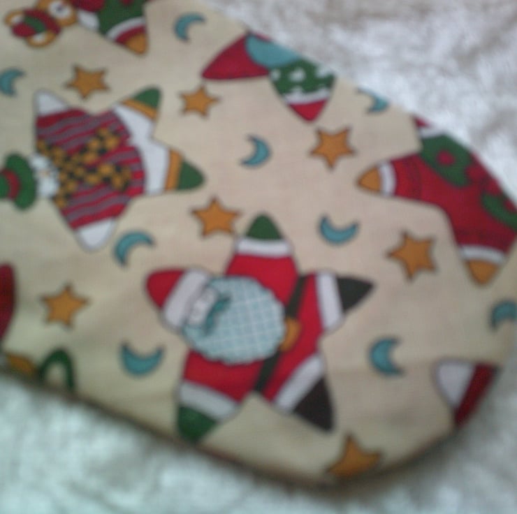The fabric used is of star shaped santa, teddy bears, snowmen and angels on a white background - the reverse side is the same design