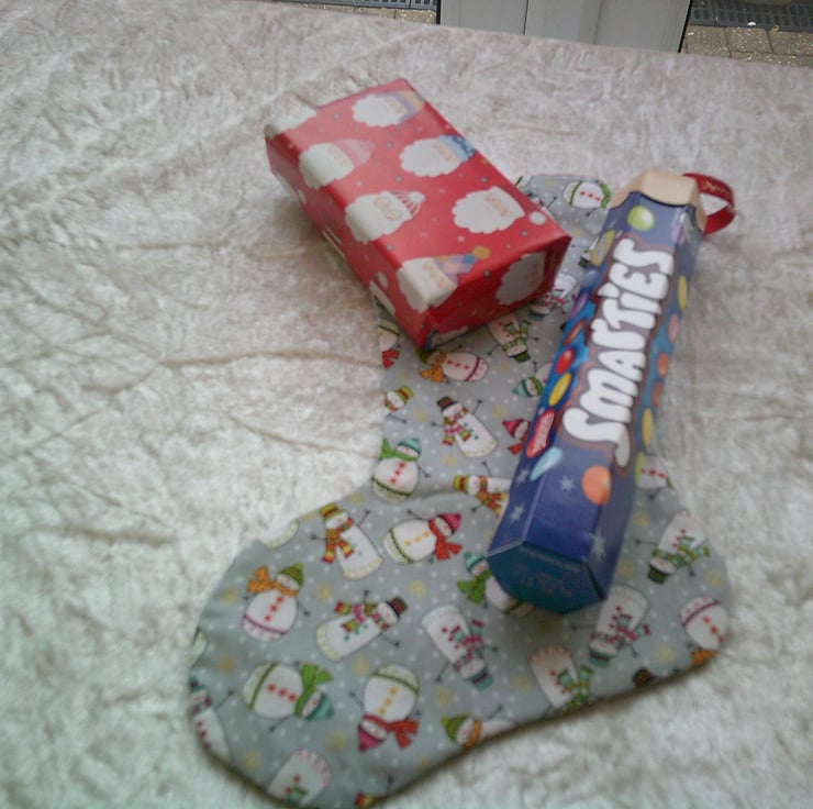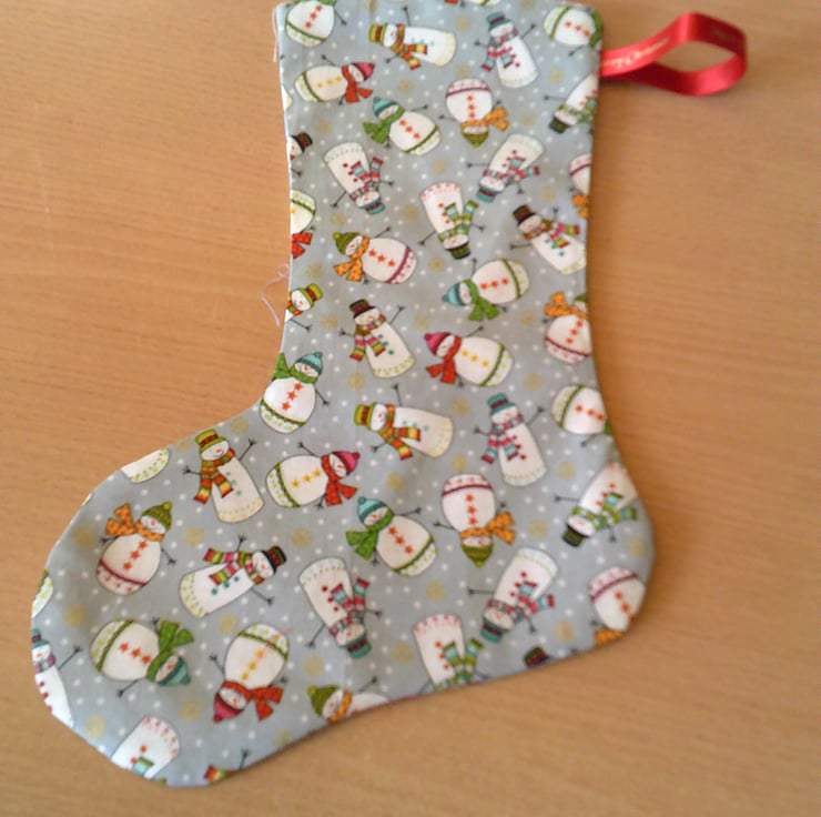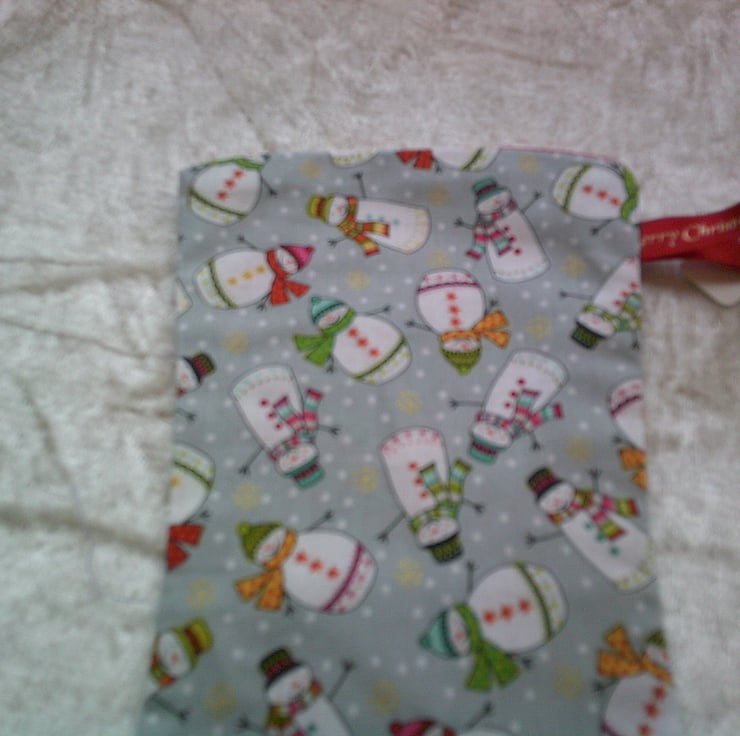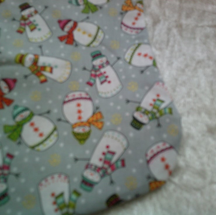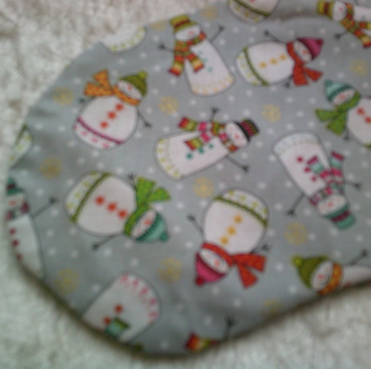 The fabric used is of snowmen sporting colourful hats and scarves on a pale grey background.